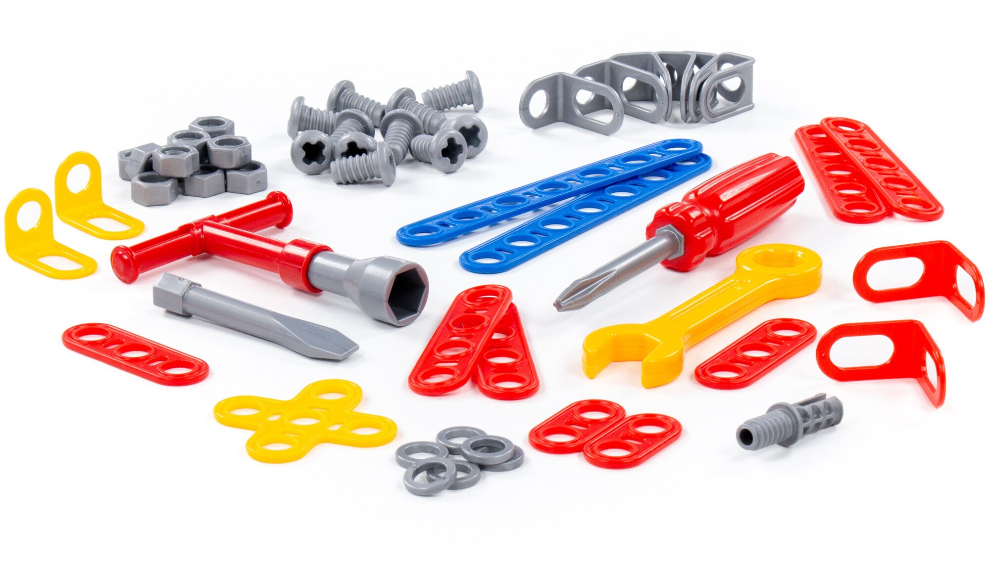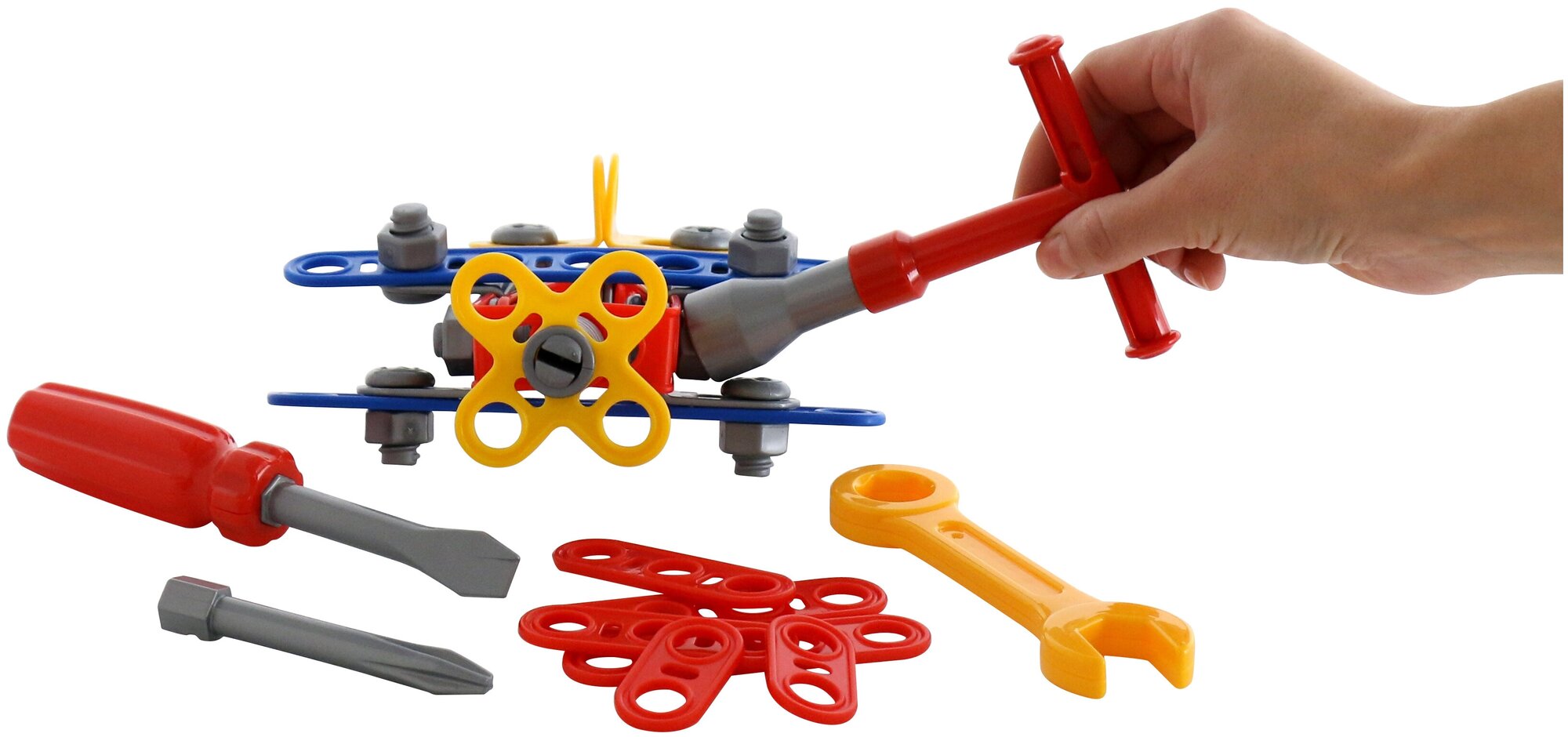 Конструктор Самолет №1 собирается довольно легко. Он состоит из пластмассовых деталей яркой цветовой гаммы. Для того, чтобы собрать самолет, ребенок может пользоваться набором инструментов, который входит в комплект. Все детали данного конструктора отлично совместимы с другими деталями этой серии игрушек, продающихся отдельно, что делает возможным пофантазировать и проявить свои творческие возможности. Внимание! Цветовое исполнение деталей конструктора может варьироваться и отличаться от изображения на фото.