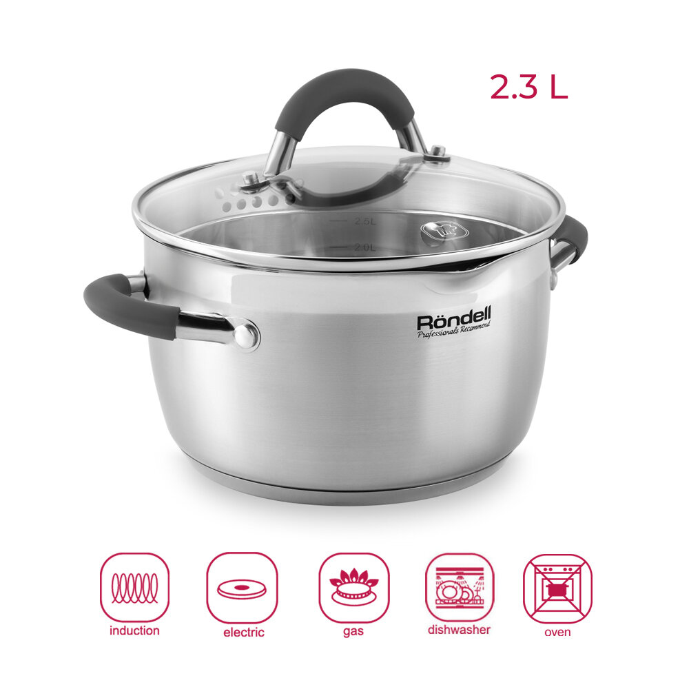 Кастрюля Rondell Flamme RDS-023, 2,3л, 18см, со стеклянной крышкой, нерж.сталь