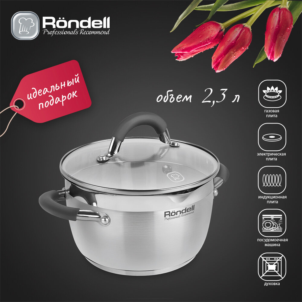 - Кастрюля Rondell Flamme RDS-023, 2,3л, 18см, со стеклянной крышкой, нерж.сталь