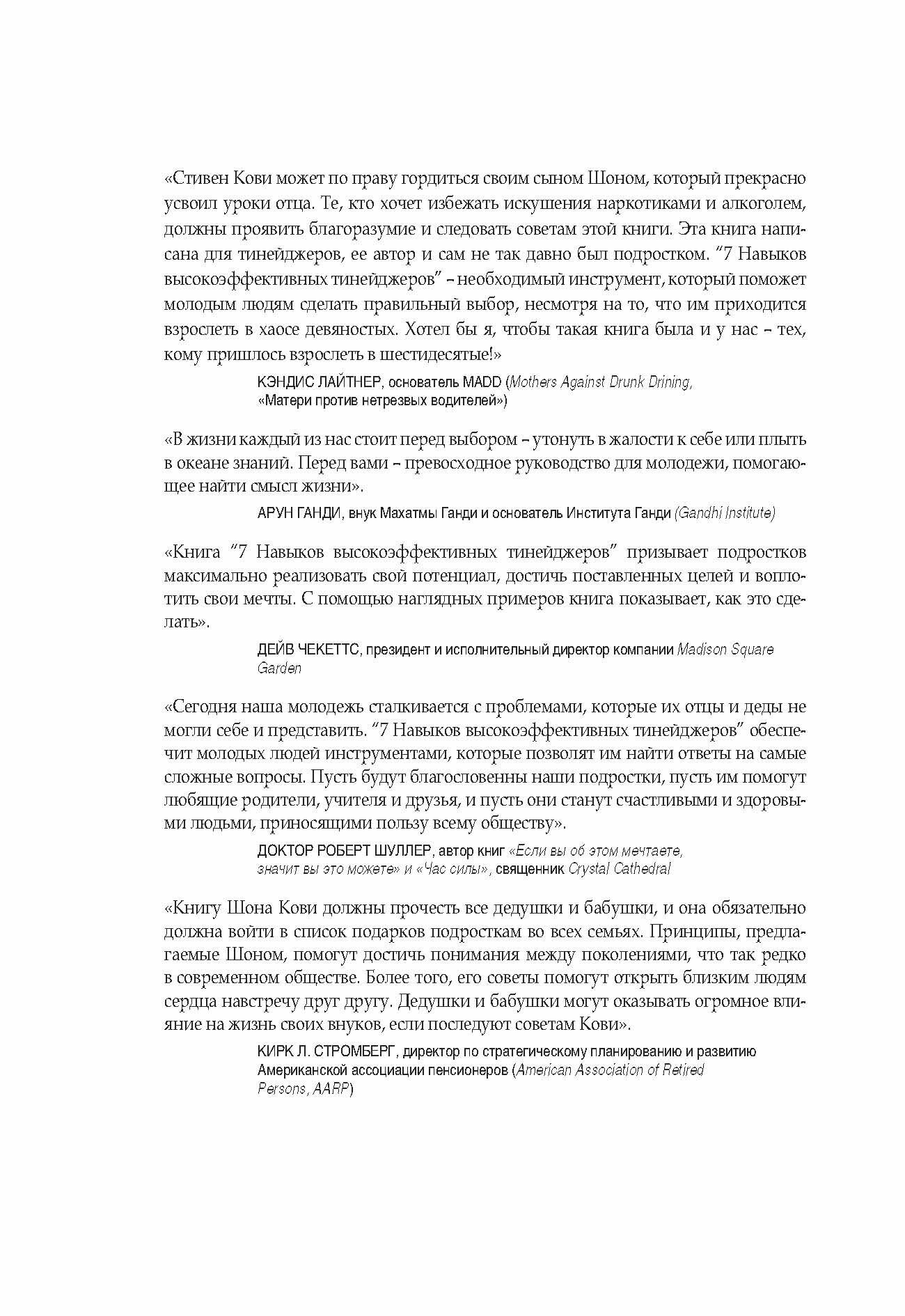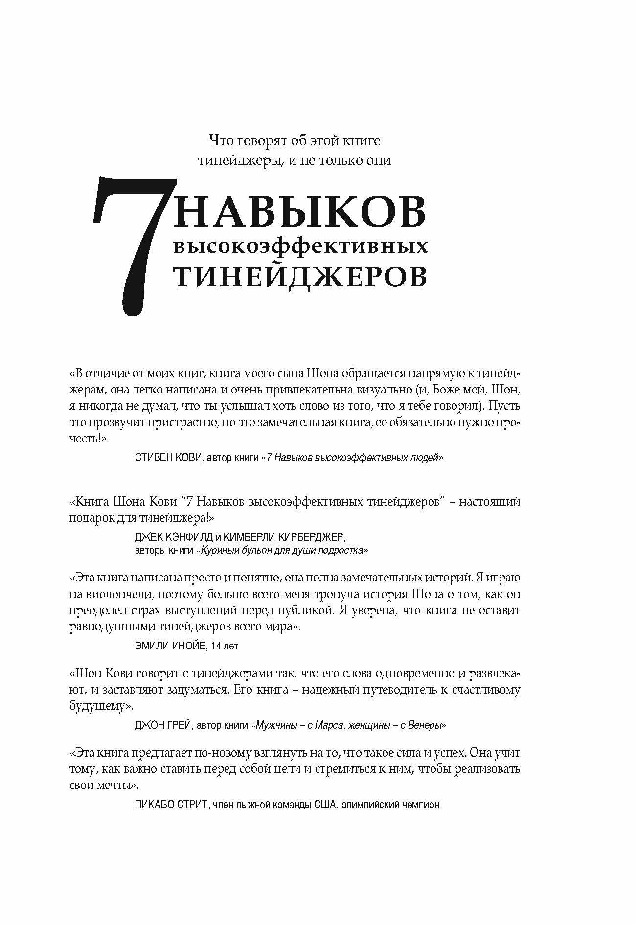 Взросление, становление личности – трудный процесс. Одиночество, ощущение ненужности заставляют подростков совершать глупости, мучить себя и окружающих. Как помочь молодым людям? В этой книге Шон Кови, напрямую обращаясь к подросткам, доверительно и просто рассказывает, как улучшить отношение к себе и отношения с родителями, как повысить самооценку, как научиться принимать важные решения. В книге много забавных рисунков, прекрасных идей, замечательных цитат и невероятных историй из жизни реальных тинейджеров всего мира. Но в ней не нашлось места занудным рассуждениям, скучным моралям и высокомерию, чем иногда грешат взрослые.