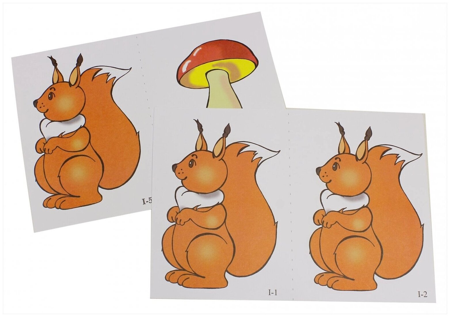 Демонстрационный материал показался мне сделанным добротно, изображения - классические (некоторым родителям и, особенно, бабушкам не нравятся "альтернативные" изображения, распростроненные в современных книгах и альбомах). А тут белочка - сразу видно белочка, а не крокодил.