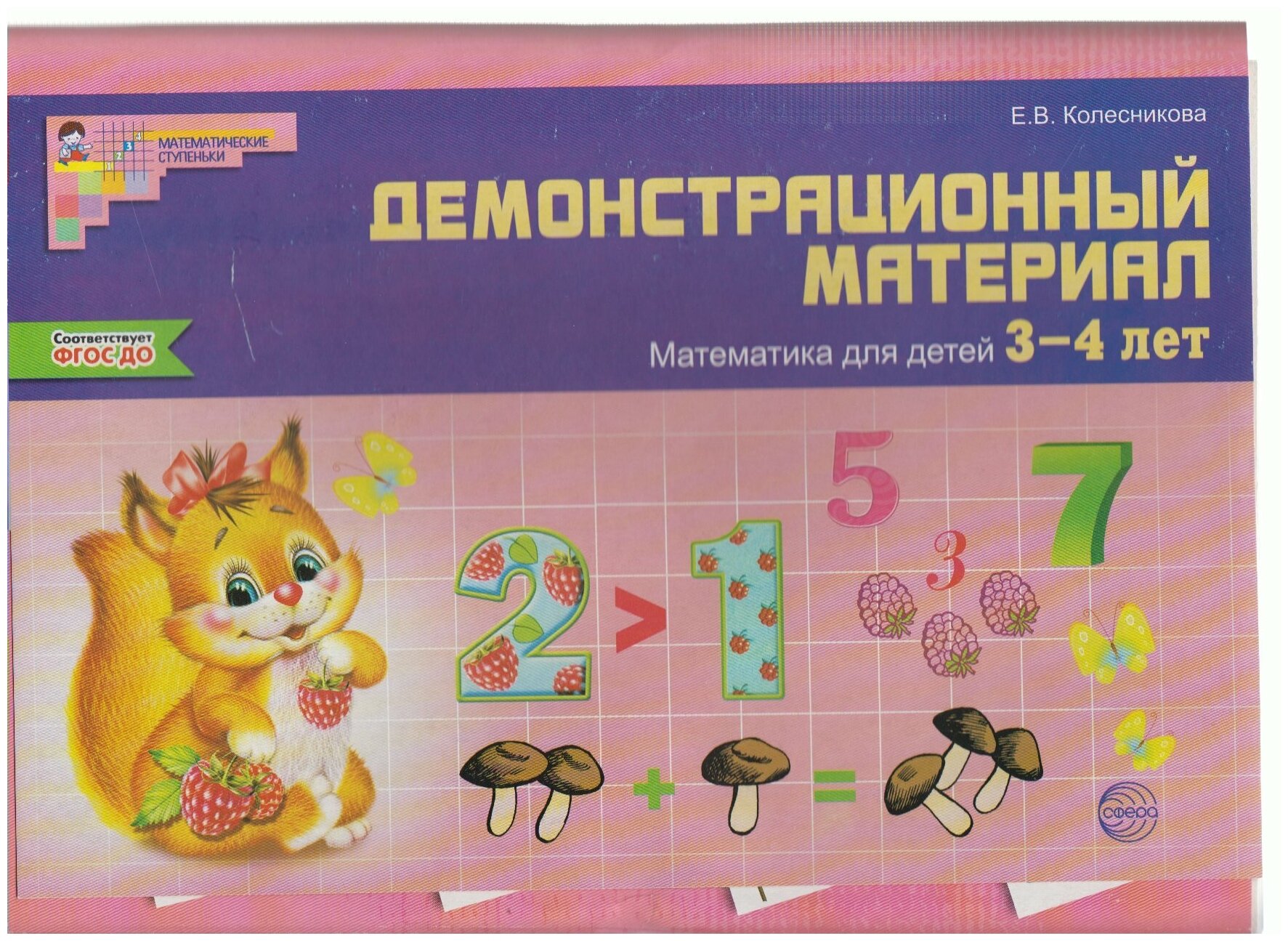 Демонстрационный материал по формированию элементарных математических представлений. Демонстрационный материал «Математика для детей 3-4 лет» входит в первую часть учебно-методического комплекта к программе Е.В. Колесниковой «Математические ступеньки», которая включает следующие пособия: 1. Математика для детей 3-4 лет. Методическое пособие. 2. Демонстрационный материал. Математика для детей 3-4 лет. 3. Я считаю до двадцати. Математика для детей 3-4 лет. В качестве демонстрационного материала используются предметные и сюжетные картинки, с помощью которых детей знакомят с количественными, временными, пространственными понятиями и представлениями, а также с характерными особенностями величины, формой предметов окружающего мира.