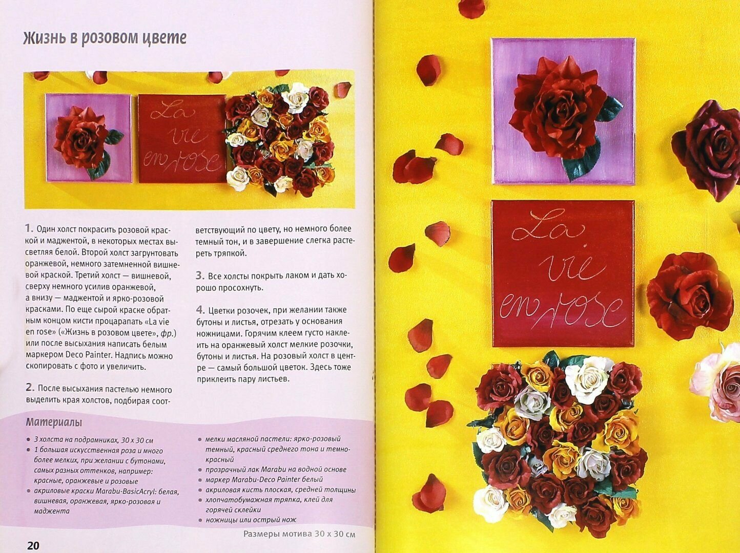 Признаться, меня очень заинтриговала эта серия издательства. Это действительно легко и просто, а эффект потрясает даже скептиков. В этой книге показано, как с помощью кувшинок, орхидей, роз, подсолнухов и других искусственных цветов, а также акриловых красок, пасты и клея (все материалы фирмы Marabu) можно превратить холст в живую картину. Материал расчитан и на тех, кто не умеет рисовать.