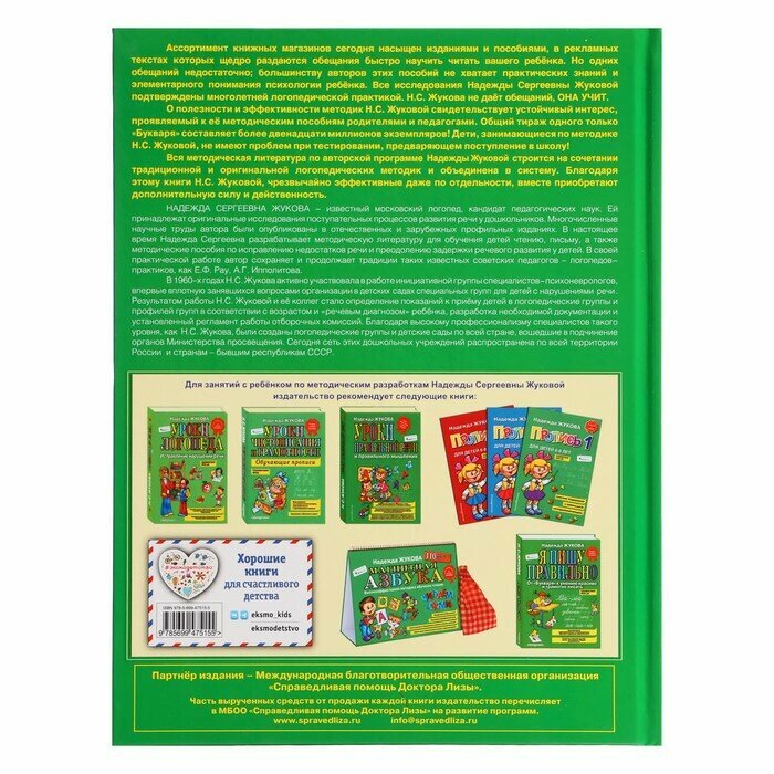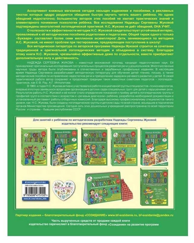 В 5 лет в детском саду дочь начала изучать буквы и пытаться читать. Это был кошмар! Во-первых неправильное было само произношение буквы и звука и соответственно само чтение не получалось, во-вторых воспитатель была казашка. Пришлось дело взять в свои руки. Посоветовавшись с логопедами купила книгу "Букварь" Н.С.Жуковой. За неделю моя дочь уже читала по слогам и правильно! А через месяц уже детские книги! Когда я сама пошла учиться на учителя-логопеда моим помощником был именно этот букварь. И я очень рада и горда тем, что два поколения ребят я выучила читать именно по ней! Она моя палочка-выручалочка и настольная книга!!!! Спасибо Надежда Сергеевна за целую серию книг, которые помогают нашим детям правильно учиться и читать!!!