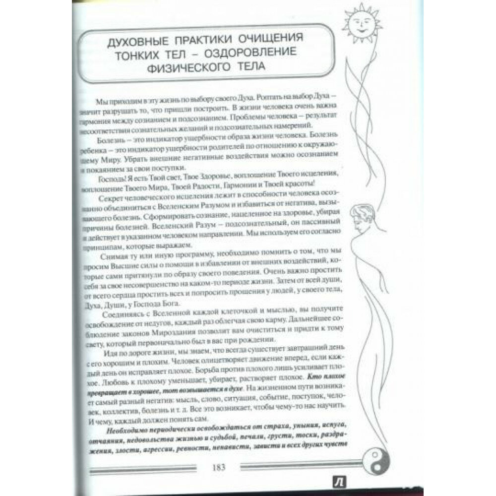 Название книги "Здоровый дух - здоровое тело" говорит о том, что дух первичен, а материя вторична и каждый человек самостоятельно может работать, очищая свой тонкий план от негативных воздействий извне. Прорабатывая ситуацию прошлого в данный момент, вы исправляете свою карму и улучшаете здоровье. Все это отражается на судьбах близких, родных людей. Повседневная практика свидетельствует, что аура каждого человека имеет разрывы, через которые происходит отток энергии, а значит и жизненной силы.