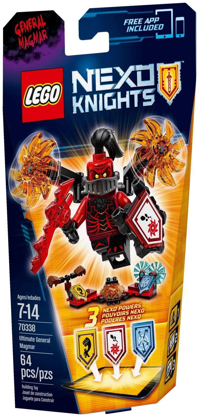 Lego Nexo Knights 70338 Генерал Магмар - Абсолютная сила - превосходный способ заинтересовать юного непоседу. Грозный военачальник сам себе на уме и крушит все на своем пути, не оглядываясь вокруг. Даже Джестро приходится с ним считаться. Сплав из ненависти, пылающего оружия и сокрушающих кулаков может оказаться смертельным для его врагов. Он может улучшить свои боевые навыки, если воспользоваться тремя щитами для сканирования, дающие в игре через мобильное приложение MERLOK 2.0 особенные силы: Камнедробилка, Вихревой ветер и Мощный удар. Lego Nexo Knights - современное и высокотехнологичное поколение рыцарей.
