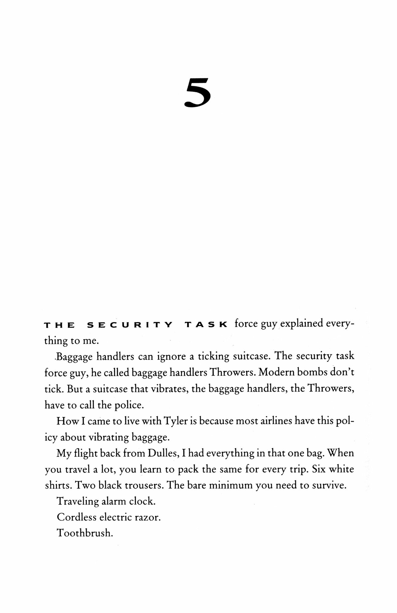 Every weekend, in basements and parking lots across the country, young men with good white-collar jobs and absent fathers take off their shoes and shirts and fight each other barehanded for as long as they have to. Then they go back to those jobs with blackened eyes and loosened teeth and the sense that they can handle anything. Fight Club is the invention of Tyler Durden, projectionist, waiter and dark, anarchic genius. And it's only the beginning of his plans for revenge on a world where cancer support groups have the corner on human warmth.