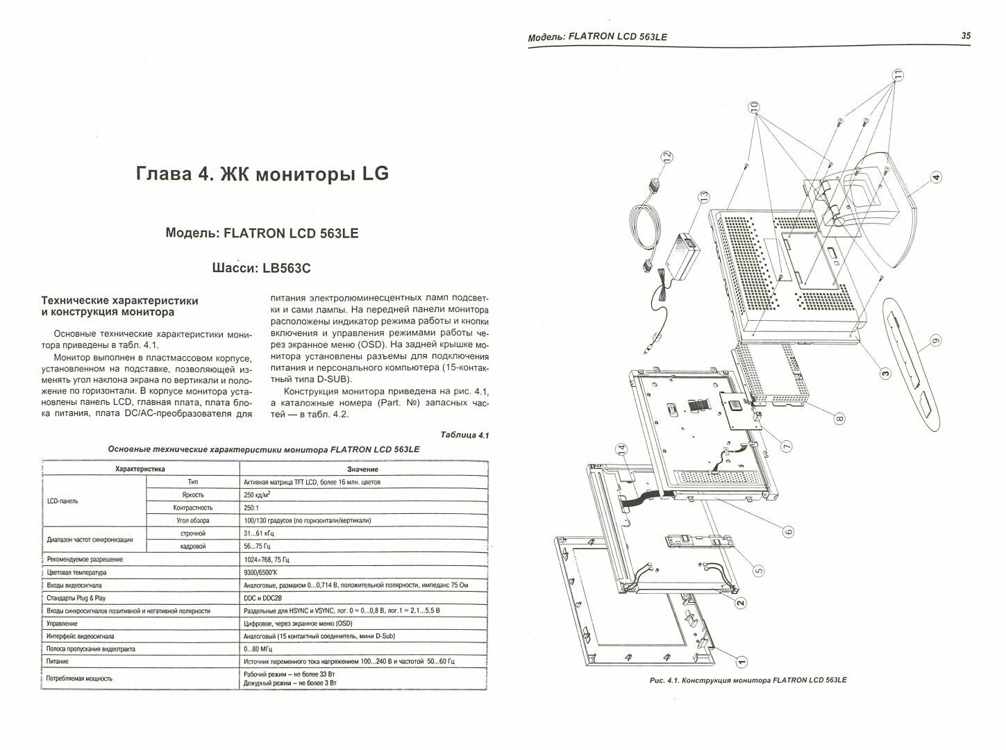 Рассмотрены восемь шасси, на которых производятся ЖК мониторы с размерами жидкокристаллической панели 15, 17 и 18 дюймов. По каждой модели приводятся ее конструкция, структурная и принципиальная электрическая схемы, подробное описание работы всех ее составных частей и порядок регулировки узлов.