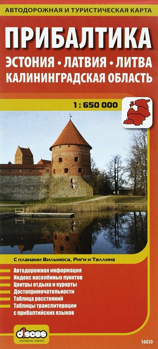Масштаб: 1: 650 000. С планами Вильнюса, Риги и Таллинна. Содержит автодорожную информацию, индекс населенных пунктов, центры отдыха и курорты, достопримечательности, таблицу транслитерации с балтийских языков.