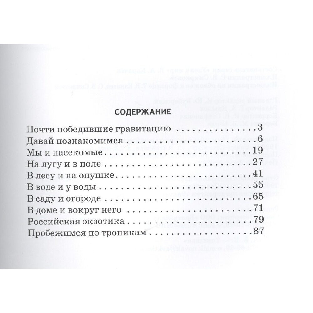 В начале книги приводятся основные сведения о насекомых (признаки, внутреннее строение, классификация ротовых аппаратов и усиков). Далее даются практические советы для наблюдения за насекомыми (на лугу, в лесу, у воды, в саду и дома) и приведена интересная информация об основных обитателя каждой зоны (все снабжено большим количество иллюстраций). 2 небольших раздела посвящены экзотическим насекомым (юга России и тропиков).