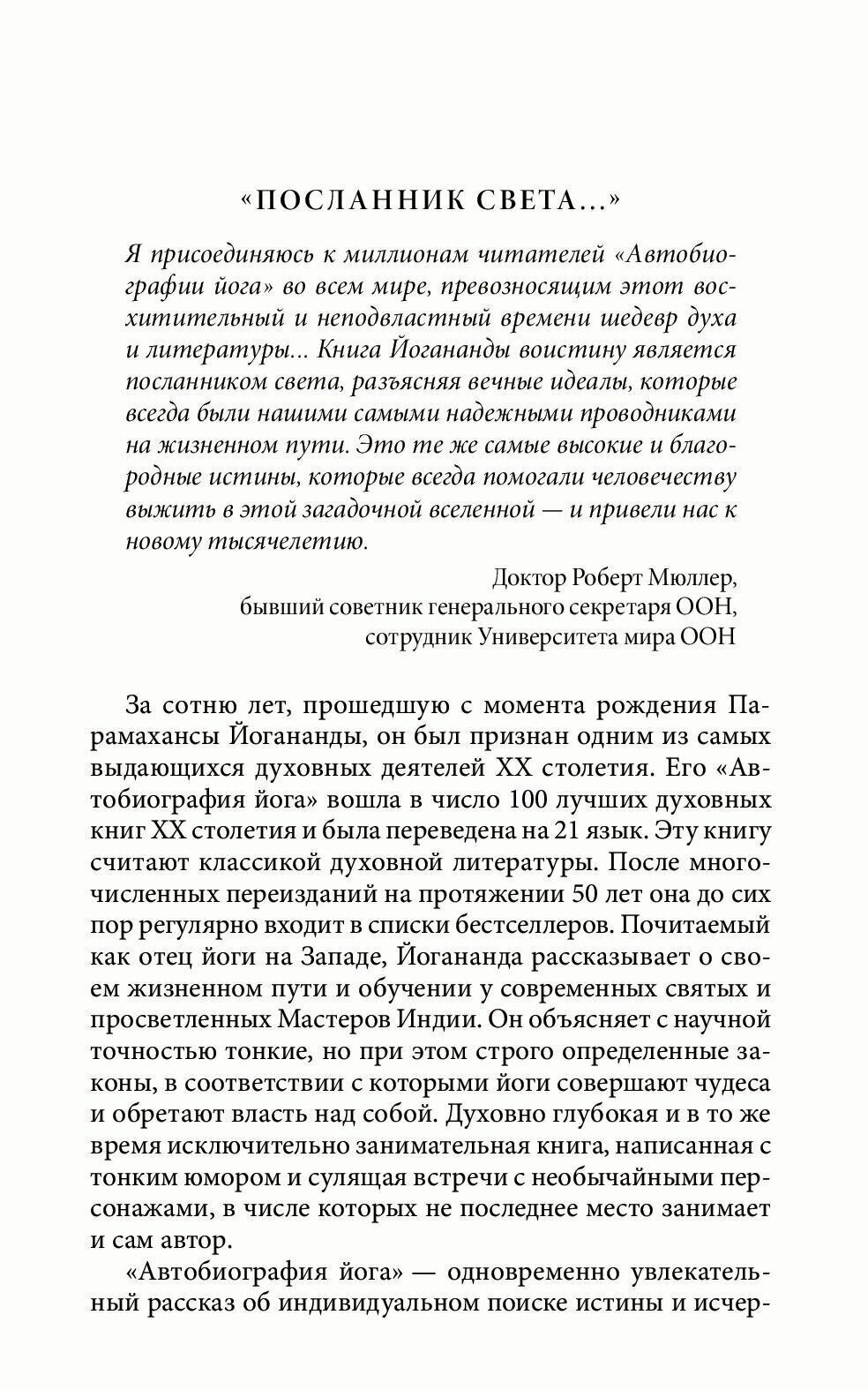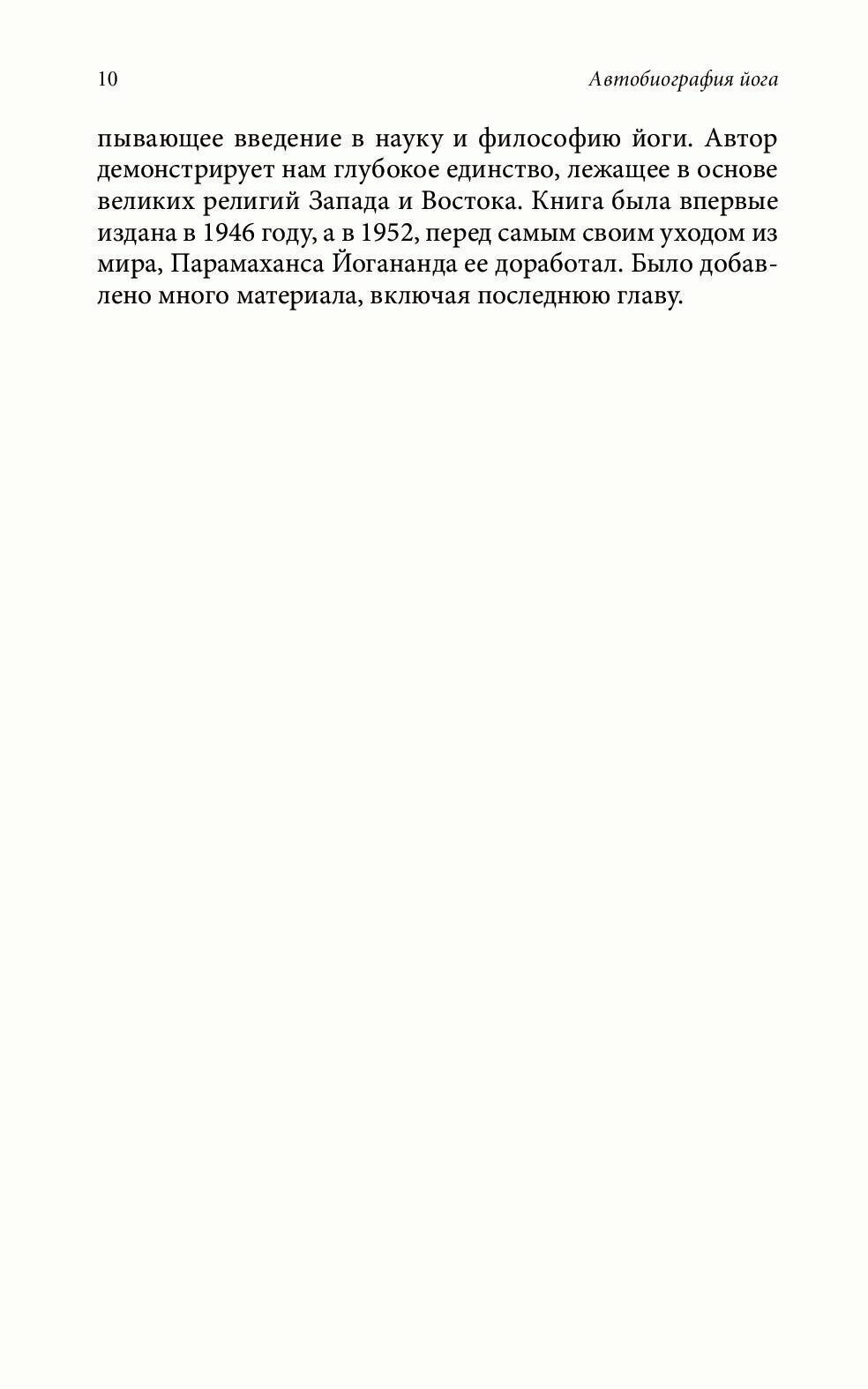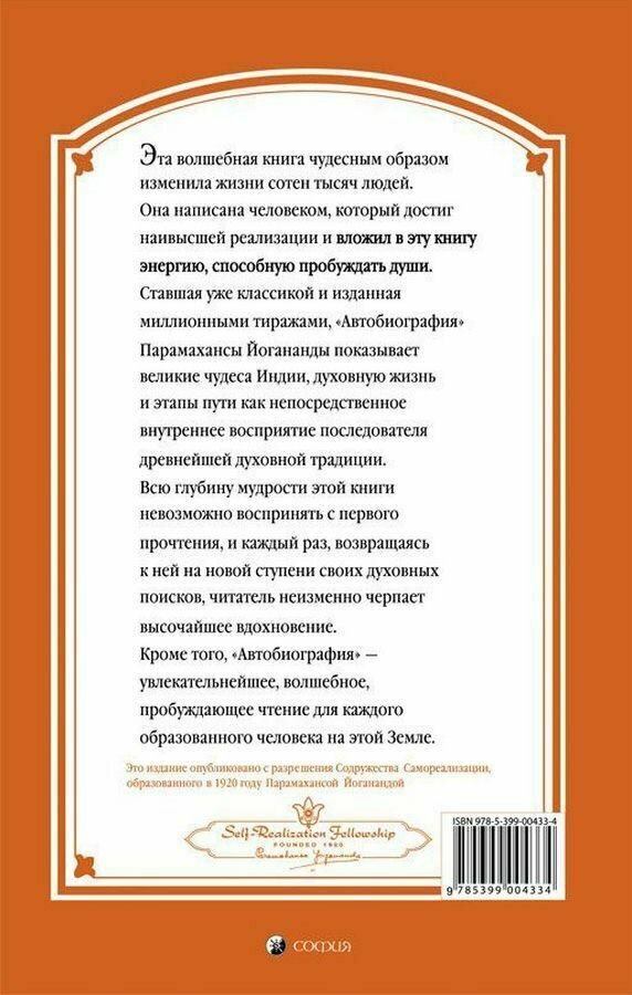 Эта волшебная книга чудесным образом изменила жизни сотен тысяч людей. Она написана человеком, который достиг наивысшей реализации и вложил в эту книгу энергию, способную пробуждать души. Ставшая уже классикой и изданная миллионными тиражами, Автобиография Парамахансы Йогананды показывает великие чудеса Индии, духовную жизнь и этапы пути как непосредственное внутреннее восприятие последователя древнейшей духовной традиции.Всю глубину мудрости этой книги невозможно воспринять с первого прочтения, и каждый раз, возвращаясь к ней на новой ступени своих духовных поисков, читатель неизменно черпает высочайшее вдохновение.Кроме того, "Автобиография" - увлекательнейшее, волшебное, пробуждающее чтение для КАЖДОГО образованного человека на этой Земле.