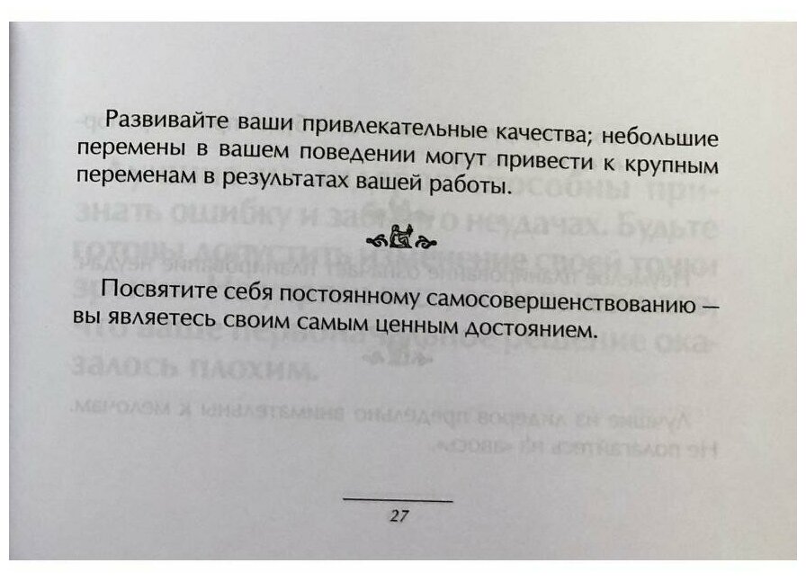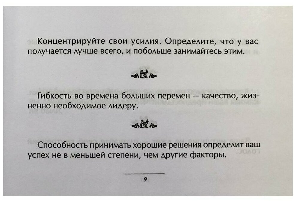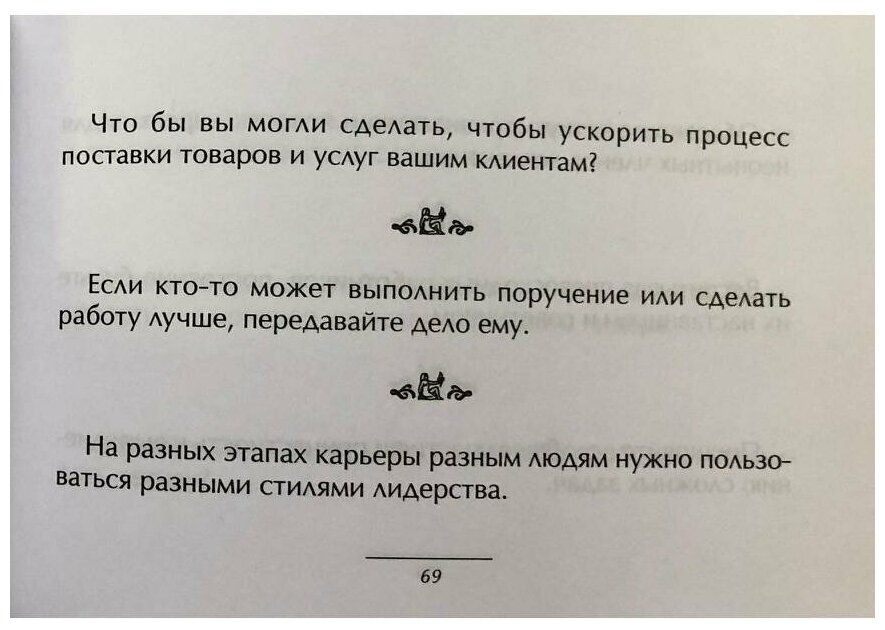 Компактный блокнот с советами для управленцев от Брайана Трейси. В тезисном виде включает в себя содержание практически всех его трудов по менеджменту. Основной акцент сделан на самосовершенствовании, личной ответственности, оптимизации деятельности руководителя и подчиненных. Внешне книга представлена в виде небольшого альбома блокнота с боковой сшивкой. Внутреннее оформление предельно лаконично - несколько абзацев текста на каждой странице. Ничего лишнего. Удобный шрифт. Я не люблю, когда много воды и пустого пространства, поэтому очень довольна приобретением.