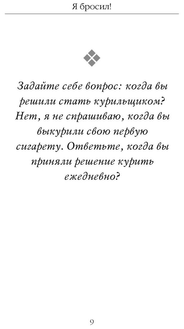 Как и все книги Аллена 100 % работает, если есть желание бросить курить, то по прочтению книги это произойдет без всяких проблем - легко! Так как книга здесь в сокращенном варианте я бы для закрепления материала посоветовал бы прочесть еще книгу "Легкий способ бросить курить", эта книга больше рассчитана на того, кто уже с помощью легкого способа бросил курить, но все еще испытывает какие-то сомнения. Приятного прочтения, и избавления от мерзкой наркозависимости, удачи.