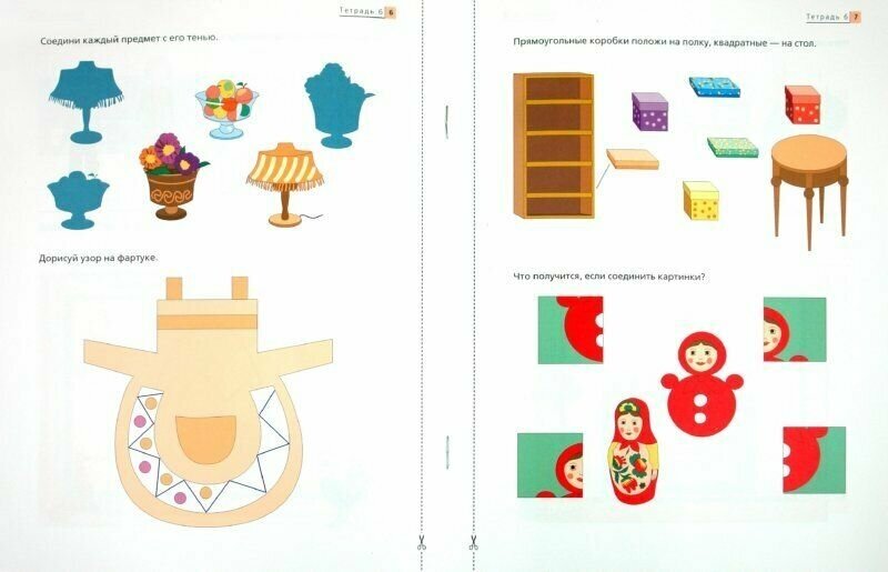 Задания тетради позволяют сформировать у ребенка умения соотносить группы предметов между собой, составлять целое из частей, помогают развить мелкую моторику рук, воображение, внимание, логическое мышление.