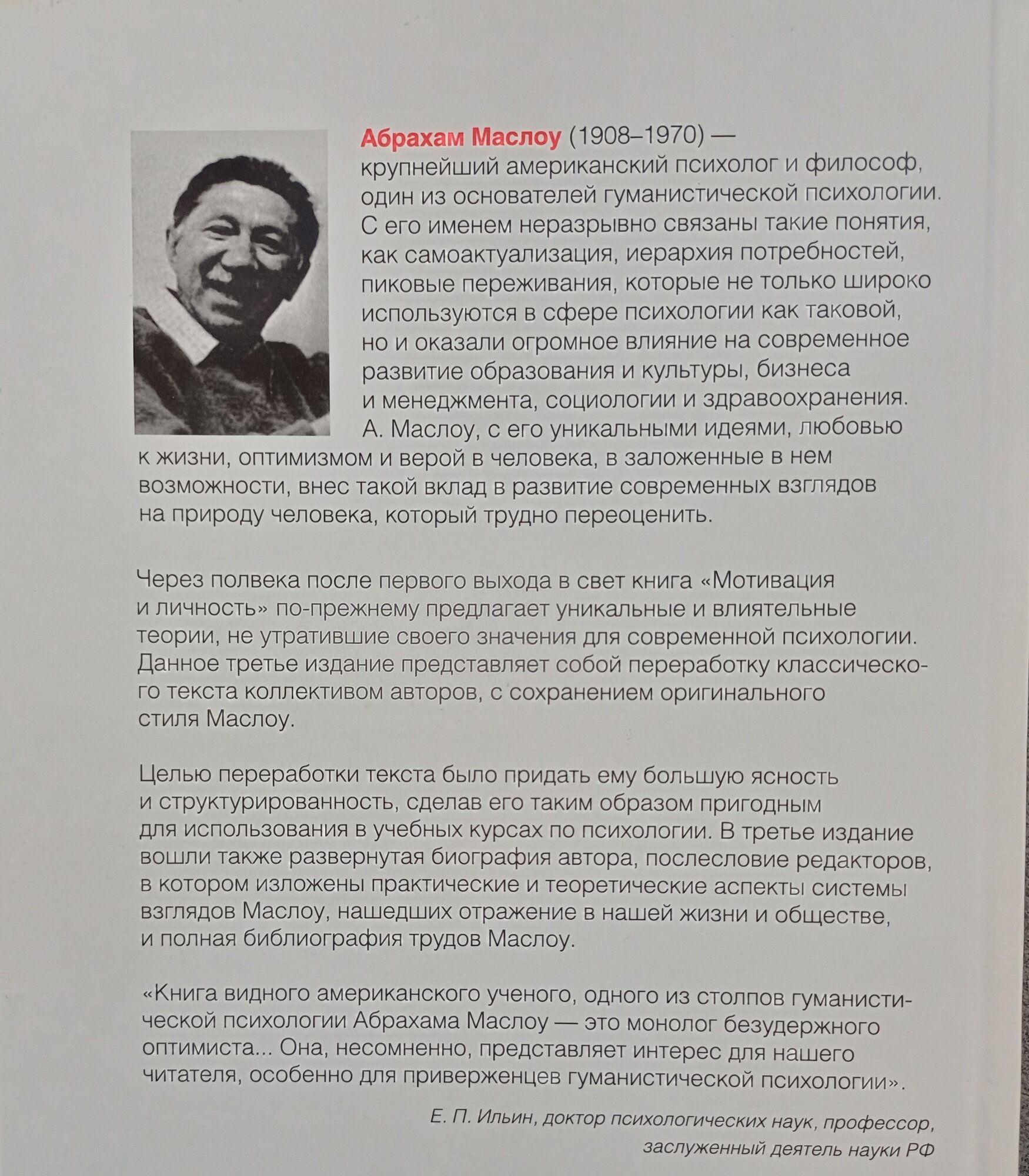 Более чем через полвека после первого выхода в свет книга "Мотивация и личность" по-прежнему предлагает уникальные и влиятельные теории, не утратившие своего значения для современной психологии. Данное третье издание представляет собой переработку классического текста коллективом авторов, с сохранением оригинального стиля Маслоу. Целью переработки текста было придать ему большую ясность и структурированность, сделав его таким образом пригодным для использования в учебных курсах по психологии. В третье издание вошли также развернутая биография Маслоу, послесловие редакторов, в котором они излагают практические и теоретические аспекты системы взглядов Маслоу, нашедших отражение в нашей жизни и обществе, и полная библиография трудов Маслоу.