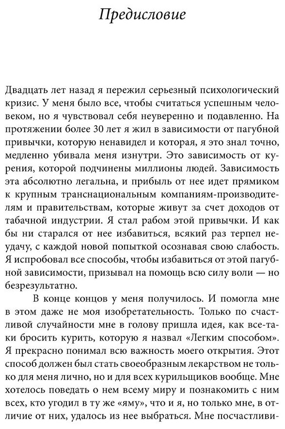 Это прекрасная книга, которая поможет вам разобраться в механизмах ловушки курения, с подробными описаниями всех уловок и мифов которыми курильщики кормят себя на протяжении всей жизни. Читая, я узнавала себя, свой обман, мои глаза наконец полностью открылись, я стала откровенна с собой и не хочу себя больше обманывать. Бросить курить легко! Если у вас есть желание, вы освободитесь от никотиновой зависимости, а книга поможет вам в этом.
