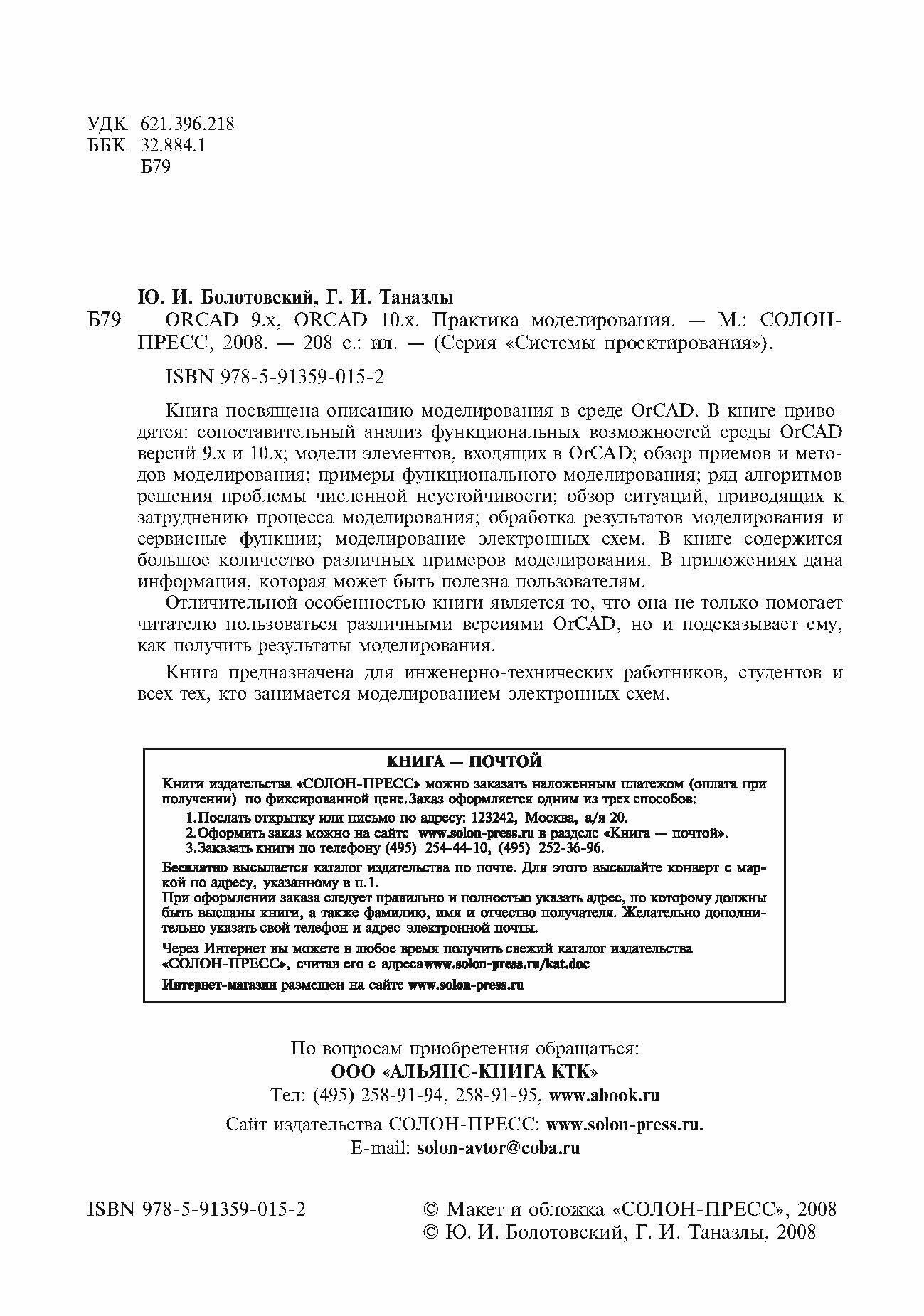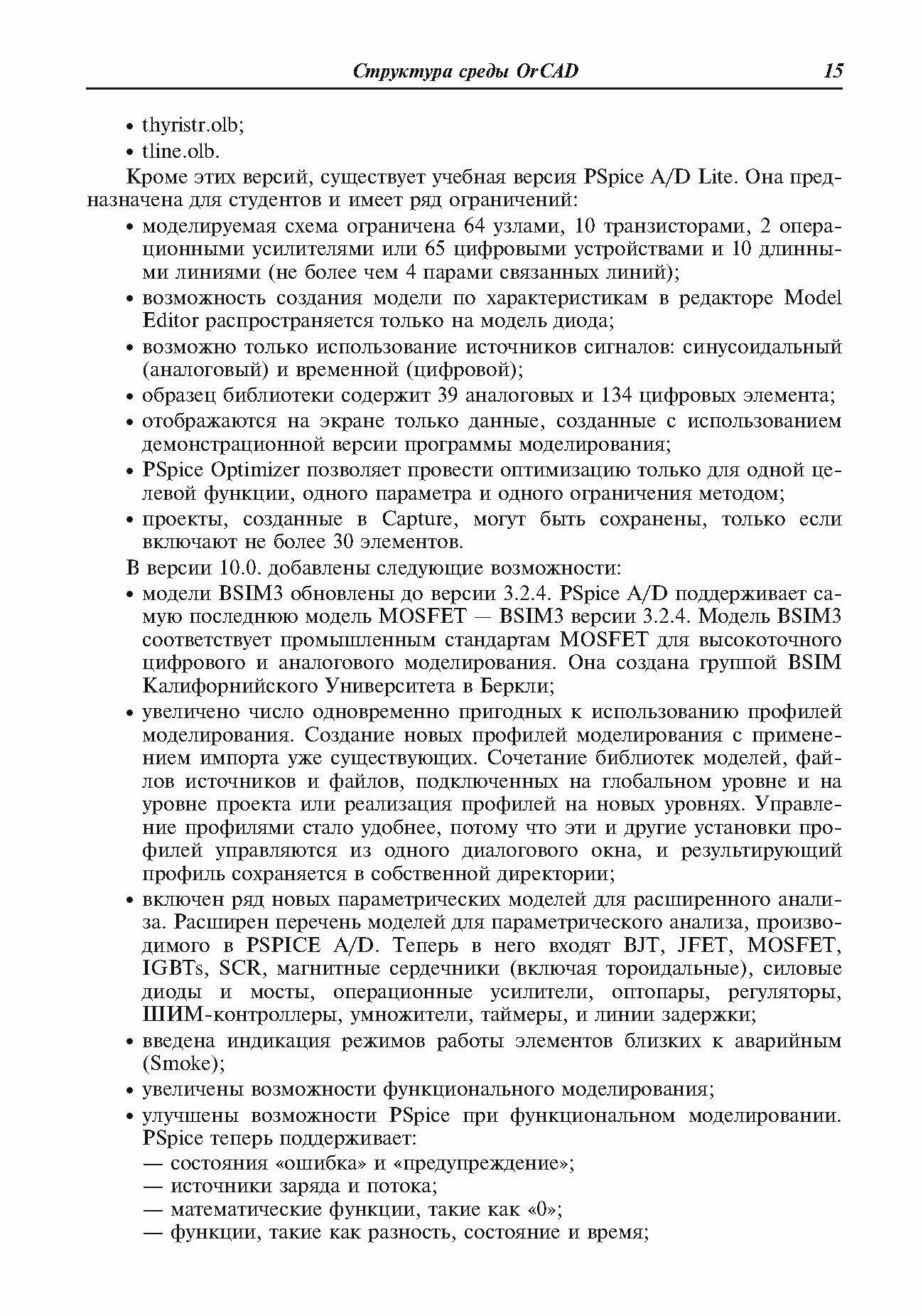 Книга посвящена описанию моделирования в среде OrCAD. В книге приводятся: сопоставительный анализ функциональных возможностей среды OrCAD версий 9.х и 10.х; модели элементов, входящих в OrCAD; обзор приемов и методов моделирования; примеры функционального моделирования; ряд алгоритмов решения проблемы численной неустойчивости; обзор ситуаций, приводящих к затруднению процесса моделирования; обработка результатов моделирования и сервисные функции; моделирование электронных схем. В книге содержится большое количество различных примеров моделирования. В приложениях дана информация, которая может быть полезна пользователям.