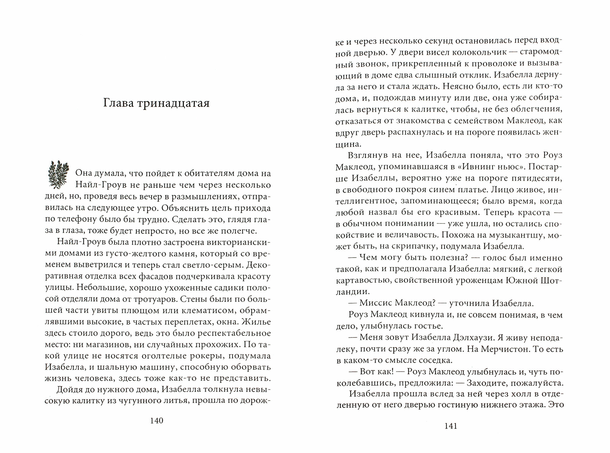 Вообще интересно следить за тем, как Изабелла все время думает, все анализирует, все замечает, искренне интересуется другими людьми и событиями вокруг. Мы все в основном ни о чем особенно не задумываемся, все на ходу делаем, а надо вообще-то смотреть по сторонам. Конечно, никаких судьбоносных решений она не принимает и глубокой философии там нет, это не захватывающий детектив и не душещипательная мелодрама, но само предложение автора остановиться, посмотреть по сторонам, подумать - вот наверное главное, что остается после чтения. -
