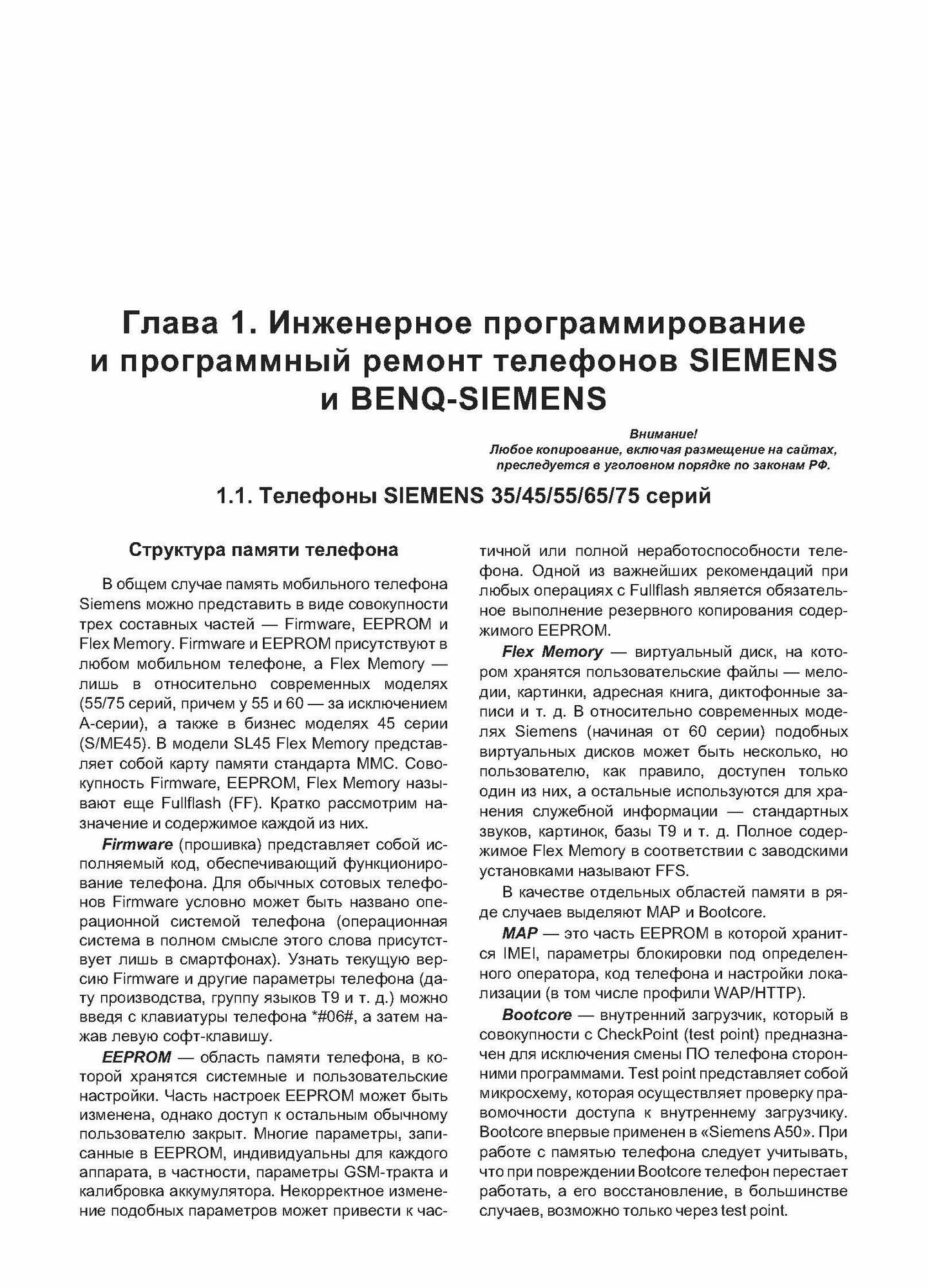 С целью систематизации материала в книге приведены материалы по инженерному программированию и программному ремонту целых аппаратных платформ телефонов. Где это необходимо, дополнительно рассматриваются отдельные модели и серии телефонов.