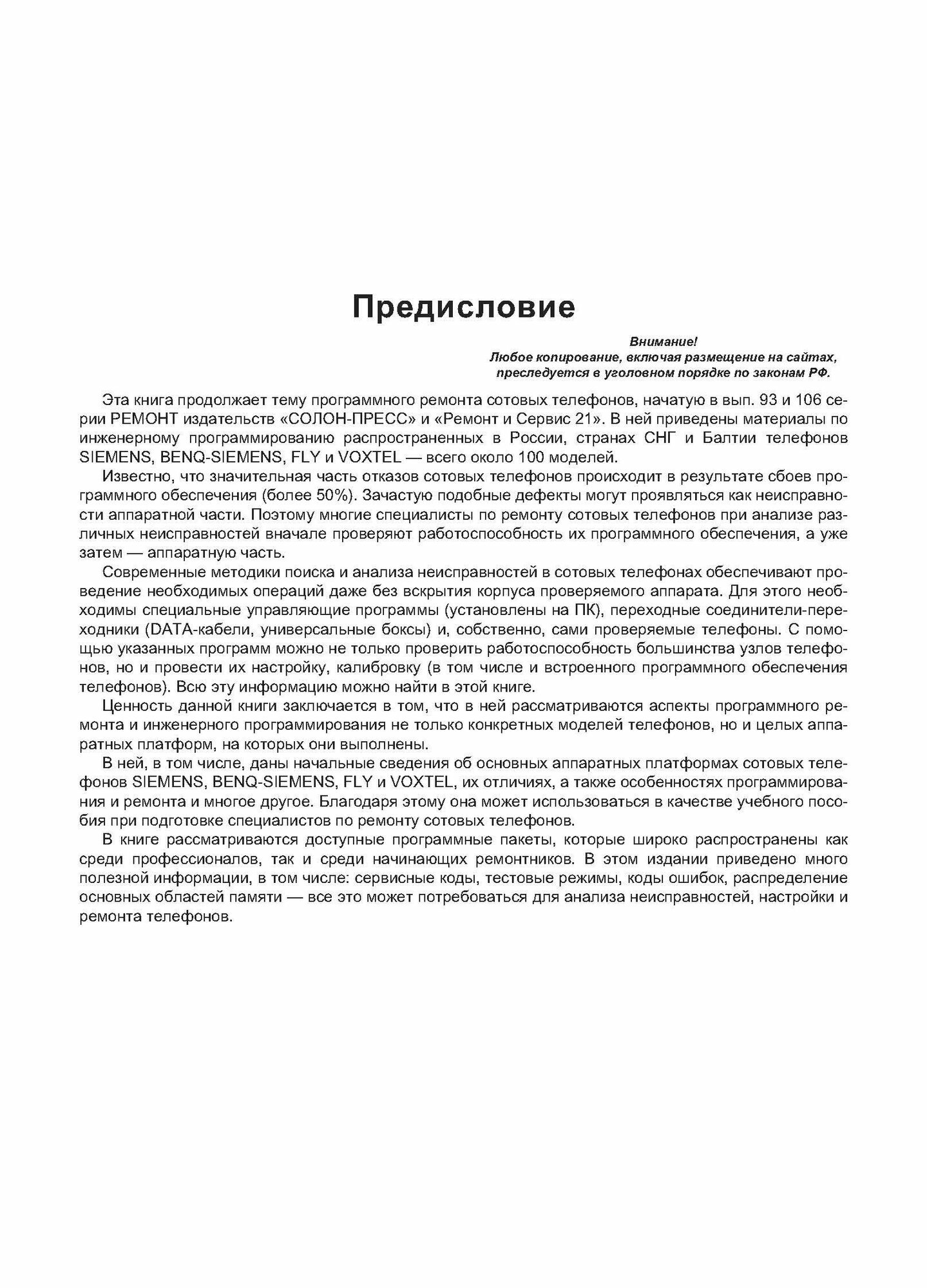 Эта книга является логическим продолжением книг издательств "Ремонт и Сервис 21" и "СОЛОН-ПРЕСС" (серия РЕМОНТ, выпуски 93 и 106) по теме программного ремонта сотовых телефонов.
