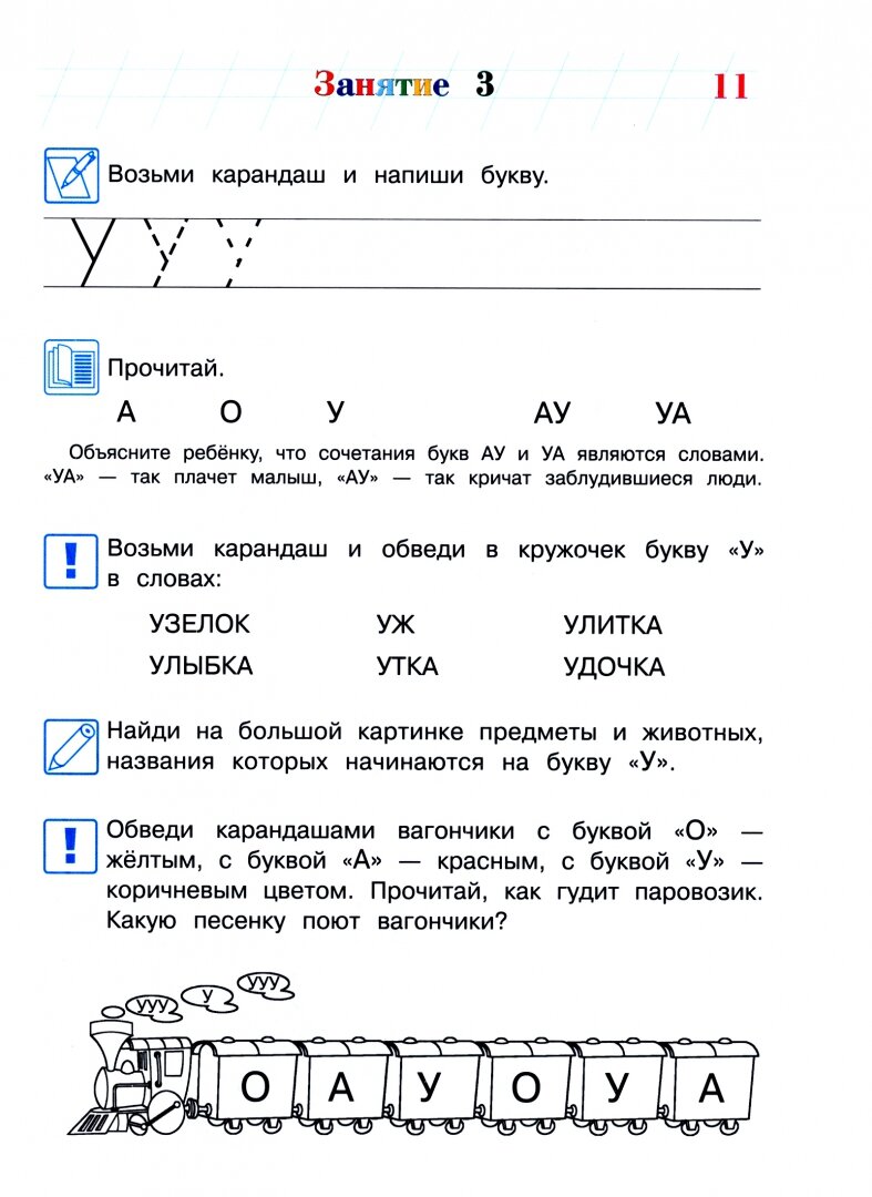 В качестве примера первое занятие разобрано очень подробно. Какждое задание в занятии имеет свое условное обозначение, т.е. увидев значок ребенку легче понять, что от него требуется.