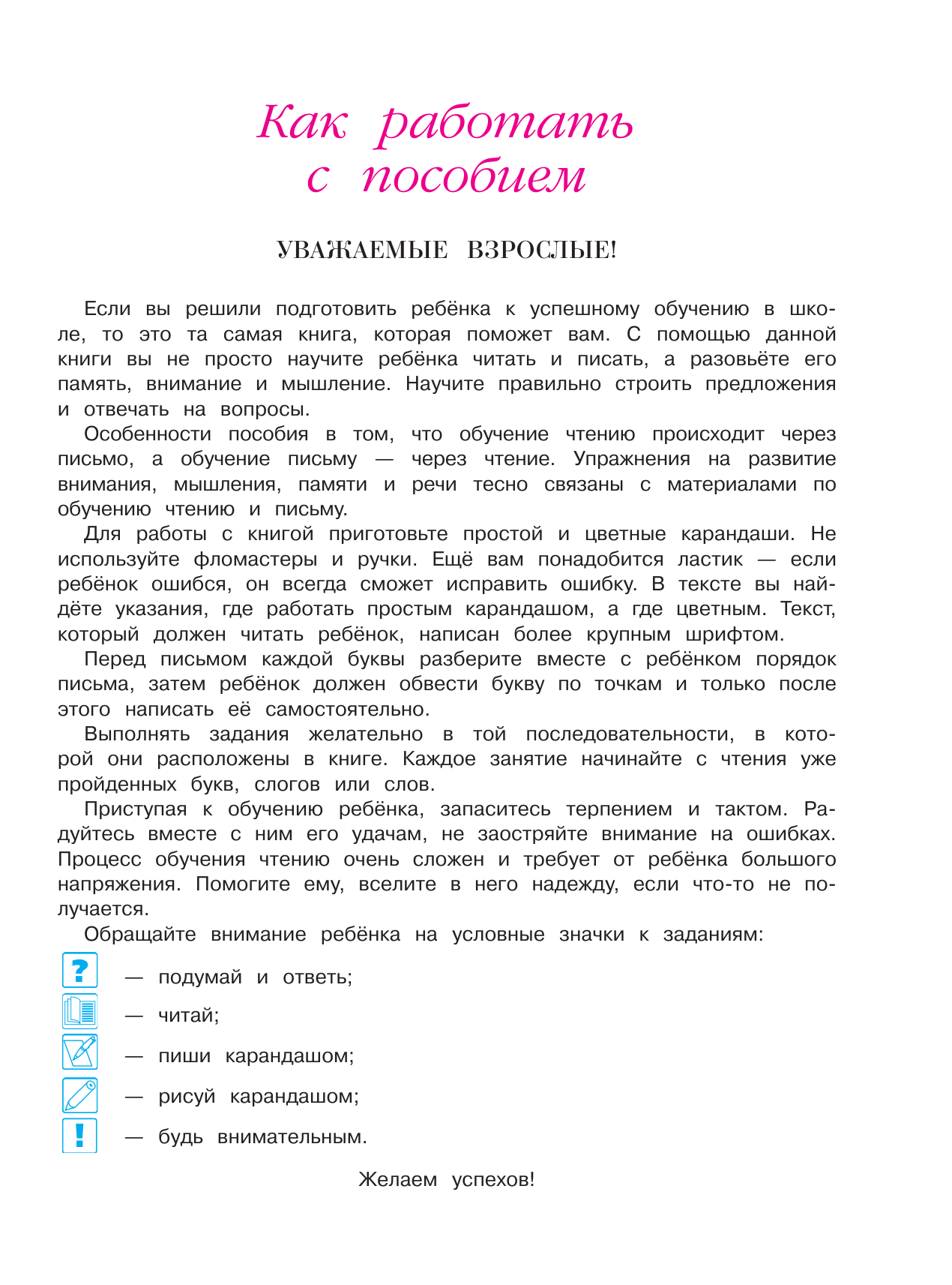 Цель данного пособия - научить ребенка читать по слогам, писать печатными буквами слова и предложения. При этом ребенок учится различать гласные и согласные звуки и буквы, твердые и мягкие, звонкие и глухие согласные; определять ударную гласную и количество слогов в слове.