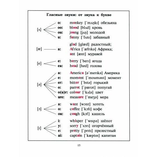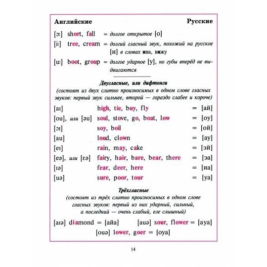 Отличный справочник по английской грамматики. Начинается с алфавита, правилам транскрипции: когда в каком сочетании произноситься, когда не произноситься тот или иной звук. Очень подробно описаны правила чтения согласных и гласных букв. Далее начинается глава словообразование. Далее части речи. Более 100 страниц пособия посвящено глаголам. Весь материал сгруппирован в таблицы и схемы с кратким четким описание правил. Важные моменты выделены красным цветом, некоторые слова пропечатаны черным полужирным шрифтом - все это способствует легкому зрительному восприятию, и является помощью для включения зрительной памяти.Материал систематизирован от простого к сложному. Транскрицпия отсутствует, за исключением разделов алфавита и словообразования. Удобное пособие, которое будет полезно на протяжении всей школьной программы изучения (НЕ! углубленного) английского языка
