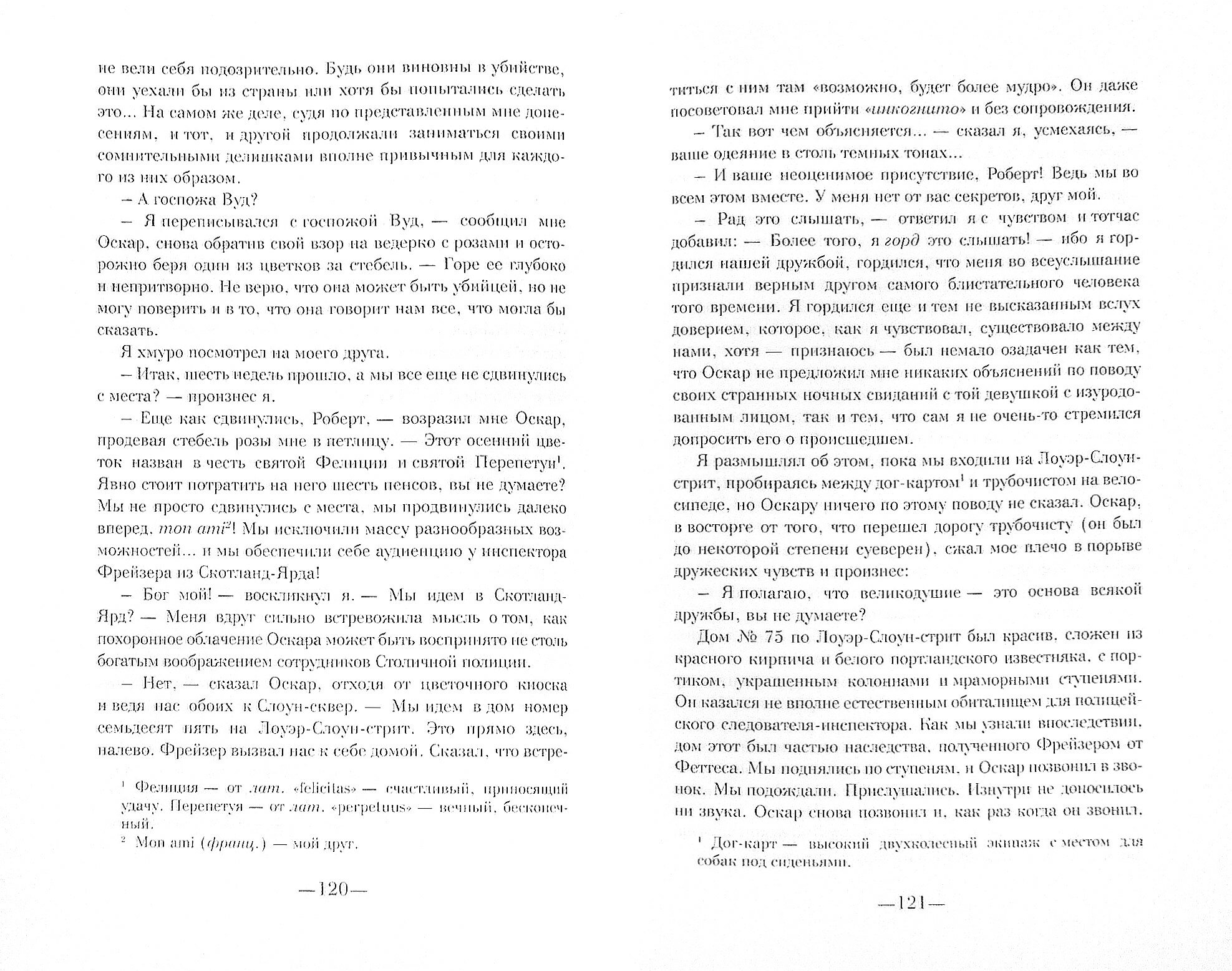 Качественный перевод, хороший язык, приятный, неспешный стиль повествования. Оно ведётся от имени Роберта Шерарда, исполняющего роль Ватсона при Холмсе-Уайльде. История вымышленная, Оскар Уайльд - настоящий. Для меня это книга, написанная его поклонником, исследователем его жизни и творчества, но не полноценный детектив, детективная линия - это лишь способ привлечь больше внимания к личности и биографии Оскара Уайльда. Это полгода из жизни Оскара Уайльда, доступно описано время, в которое он жил. Прочитав три четверти книги, я поймала себя на мысли, что мне собственно всё равно кто там убийца, хотя угадать его не трудно - круг подозреваемых узок, и автор недвусмысленно намекает уже в середине книги, где именно следует искать.