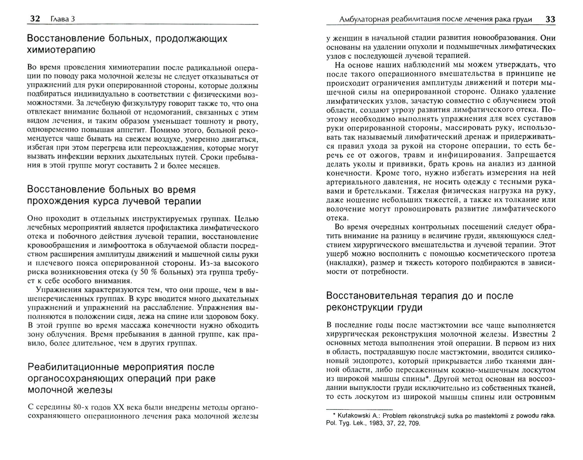 Книга посвящена проблеме комплексной реабилитации женщин, перенесших рак молочной железы, и представляет собой плод многолетних научных исследований и практической деятельности автора в Варшавском Онкологическом центре. Большую часть книги занимают иллюстрированные комплексы лечебной гимнастики, подобранные в зависимости от проводимого лечения и физического состояния пациенток, описание допустимых видов массажа, физиолечения и психотерапии. Читатели найдут ответы на вопросы как бороться с лимфатическими отеками, как вести себя во время лучевой и химиотерапии, как подобрать протез груди, как питаться и одеваться, как поделить обязанности в семье, как вернуться к полноценной жизни в семье и обществе, а также можно ли после удаления груди заниматься спортом, водить машину, ездить на курорт. Книга адресована врачам-онкологам, реабилитологам и психологам, а также пациентам.
