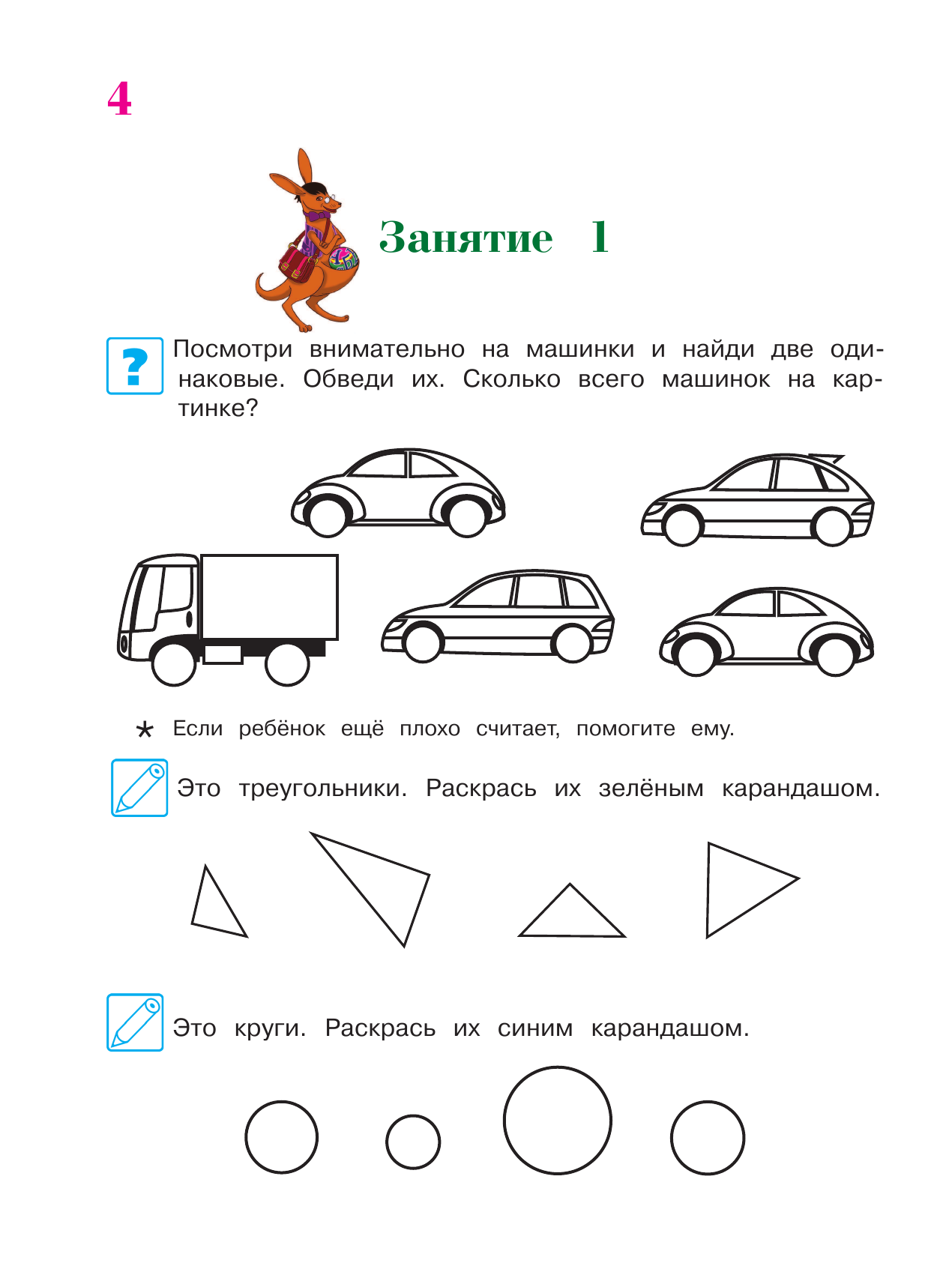Первая часть знакомит ребенка с цифрами и числами в пределах 10, с порядковым счетом и понятиями «больше», «меньше», «столько же», с геометрическими фигурами, а также сложением прибавляя 1. Ребенок тренируется писать цифры, линии