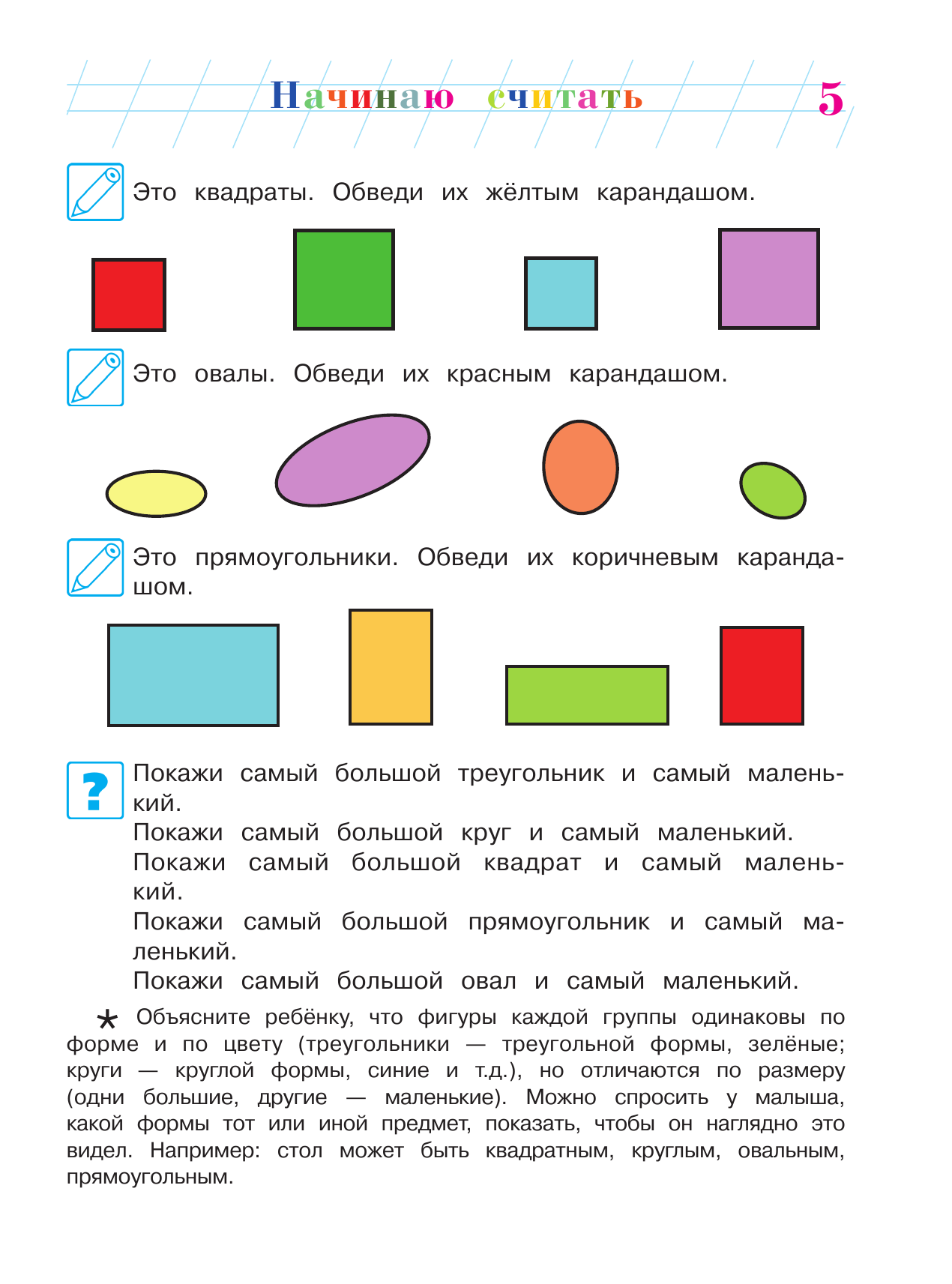 Для взрослых в конце пособия даны общие рекомендации, о том, как лучше и правильнее знакомить ребенка с цифрами, числами, счетом, цифрой «ноль», геометрическими фигурами и сравнением чисел. -