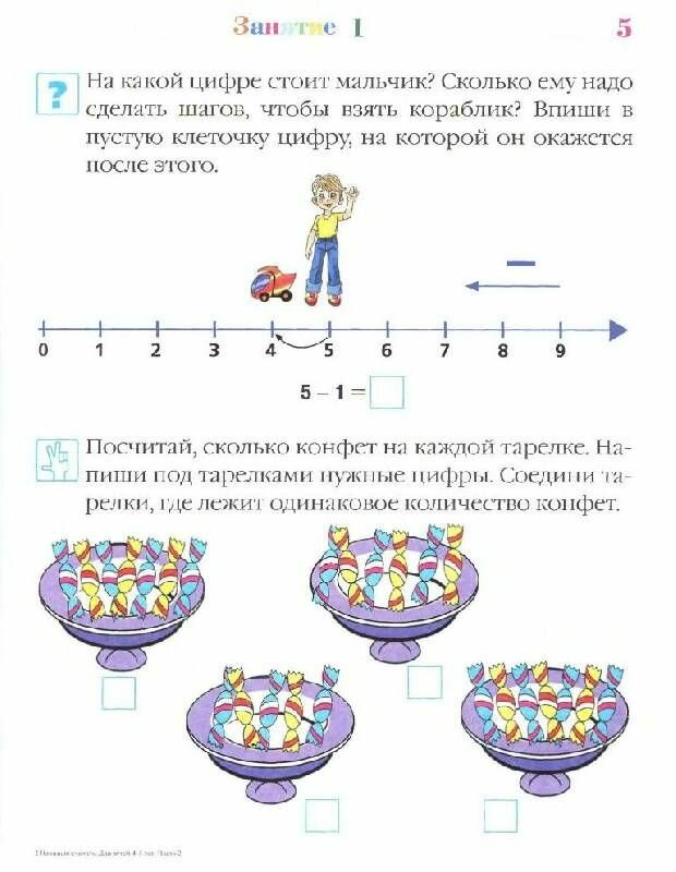 Вторая часть пособия предлагает ребенку заняться сложением и вычитанием. Изучается счет с помощью числовой прямой, решаются примеры по математической лесенке. Закрепляются навыки письма и сравнения. Появляются задания по прохождению лабиринтов, память и внимание, восприятие заданий на слух.
