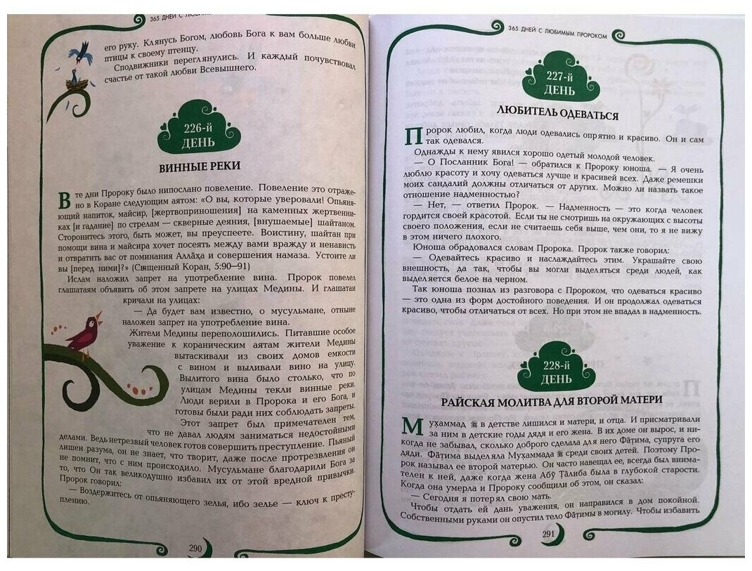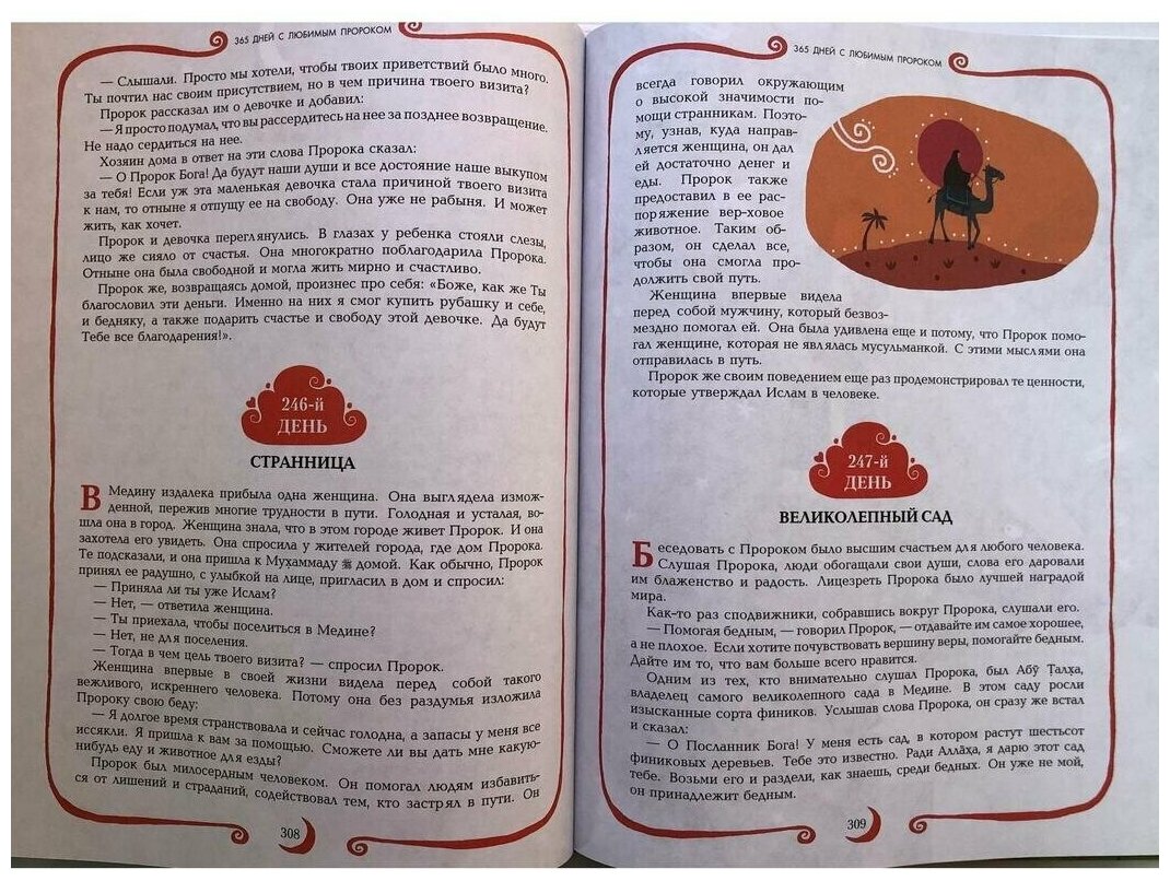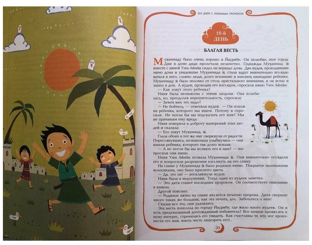 В этой великолепной книге приводятся замечательные истории из жизни Пророка, которые родители каждый день могут читать своим детям в течение всего года. Это прекрасный пример благонравия и величия духа Пророка, которому будут следовать дети.Эта книга приглашает Пророка в ваш дом, он будет вашим гостем все 365 дней, благословляя вас и ваших домочадцев своим присутствием, озаряя поистине божественным ореолом вашу обитель. Эту книгу предлагается читать на протяжении всего года, потому что в ней и нашли отражение 365 историй из жизни Пророка, представленные в форме хронологически последовательных рассказов. Предназначена книга прежде всего для детей - пусть каждый день они слушают по одному рассказу из этой книги. Предметный указатель, приведенный в книге, поможет вам легко и удобно отыскать фрагменты, касающиеся несравненных качеств Пророка и его сподвижников - щедрости, преданности, гостеприимства, честности, миролюбивости, милосердия; воспитать характер ребенка на примере высоких идеалов поведения.