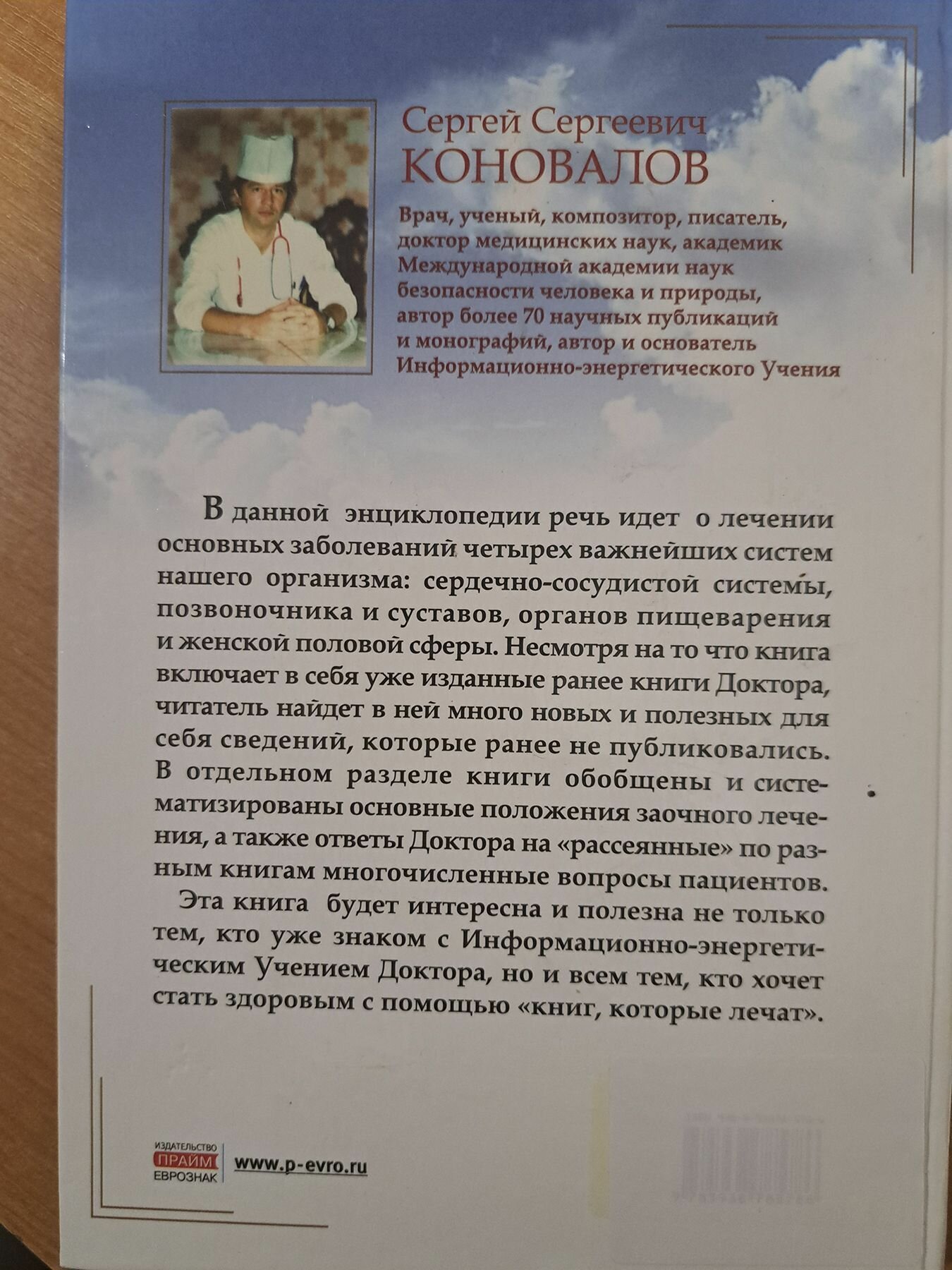 В данной энциклопедии речь идет о лечении основных заболеваний четырех важнейших систем нашего организма: сердечно-сосудистой системы, позвоночника и суставов, органов пищеварения и женской половой сферы. Несмотря на то, что книга включает в себя уже изданные ранее книги Доктора, читатель найдет в ней много новых и полезных для себя сведений, которые ранее не публиковались. В отдельном разделе книги обобщены и систематизированы основные положения заочного лечения, а также ответы Доктора на "рассеянные" по разным книгам многочисленные вопросы пациентов.