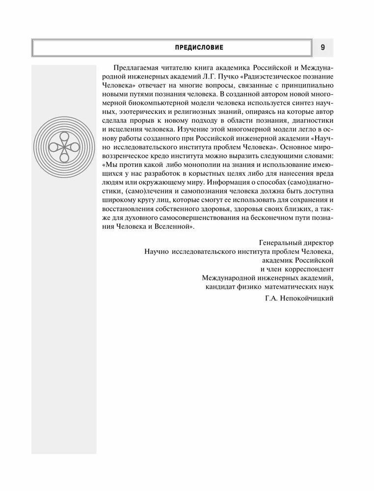 Помимо устранения уже существующих проблем в организме, в своей новой книге Л.Г. Пучко предлагает алгоритм предотвращения последствий негативных жизненных ситуаций, например, семейных неурядиц, конфликтов на работе и т.д. Более того, автором разработан алгоритм работы по оптимизации связей "Высшего Я" человека с окружающими людьми, что позволит избежать конфликтов в социуме, разрядить напряженную атмосферу в семье и тем самым предупредить само появление негативных жизненных ситуаций, столь пагубно влияющих на здоровье. Книга "Радиэстезическое познание человека" научит читателя создавать эзотерический портрет личности с выявлением деструктивных элементов. Используя эти знания, человек сможет более успешно налаживать отношения с родными и близкими, друзьями и коллегами, знакомыми и даже совсем незнакомыми людьми, противостоять давлению обстоятельств и идти к своему счастью, никому не причиняя боли и вреда, в том числе и себе. Данная книга может являться учебным пособием для врачей всех специальностей, интересующихся нетрадиционной медициной, а также для всех желающих стать здоровыми и счастливыми.