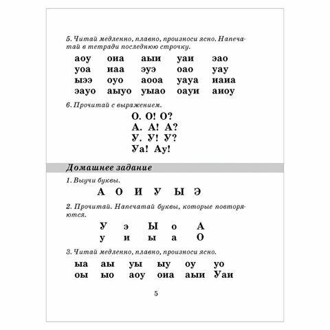 Книга состоит из 47 уроков. В начале урока несколько заданий(прочитать по строчкам или столбикам, написать, выучить, поставить ударения, определить количество слов, составить графические схемы, пересказать текст и др.). Из урока в урок задания усложняются - сначала будут буквы и их сочетания, потом слова, предложения и затем небольшие рассказики и стихи. В конце каждого урока домашнее задание. Есть небольшие черно-белые иллюстрации.