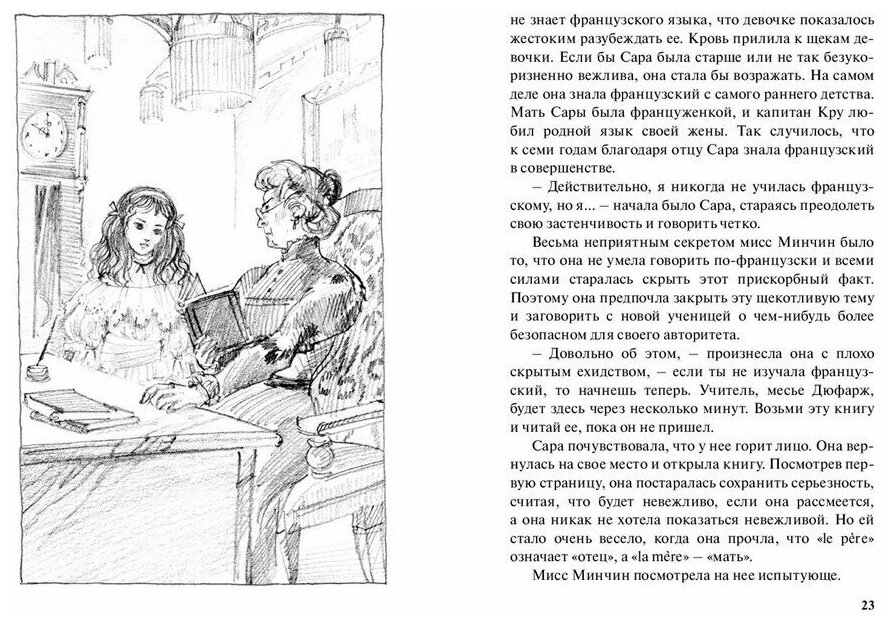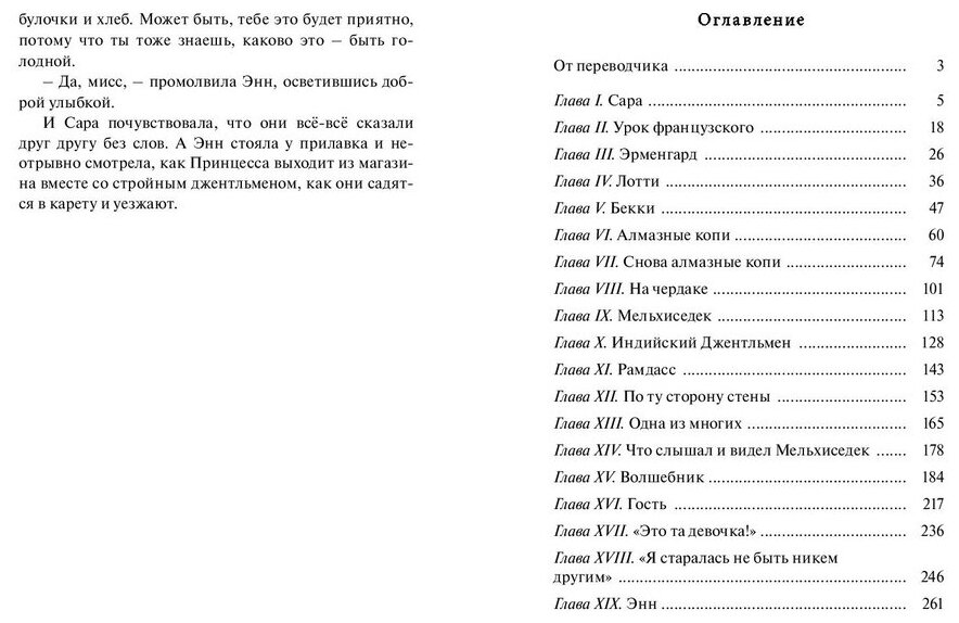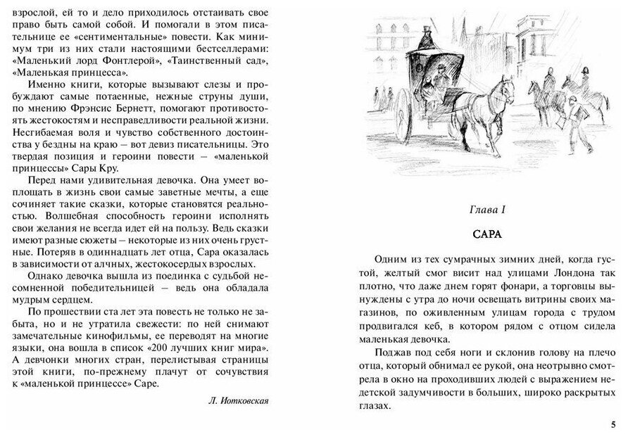 Купили книгу по рецензиям. Читали вдвоем с дочерью (12 лет). Впечатление неизгладимое у обоих,обсуждали весь вечер. Мне кажется сейчас во времена гламура и компьютерных игр, не хватает подобных произведений. Повесть легко читается (в данном издании достаточно крупный шрифт), история несколько банальна на первый взгляд маленькая девочка теряет отца. Вся суть именно в девочке умеющей радоваться жизни и понимающей значение вещей, обладающей богатой фантазией и глубоким внутренним миром . И жизнь рушится в одночасье. Но нет подросткового максимализма, как у ее подружек, а проявляется стойкость и невероятная жизненная мощь, ясная жизненная позиция. Её величественность принцессы не в капризности и в возвышенности над другими, а в признании окружающих, что она - Принцесса Сара! Писать про эту повесть можно много, но гораздо интереснее ее прочитать. Такие произведения пишутся и читаются на одном дыхании, потому что идут от сердца к сердцу!