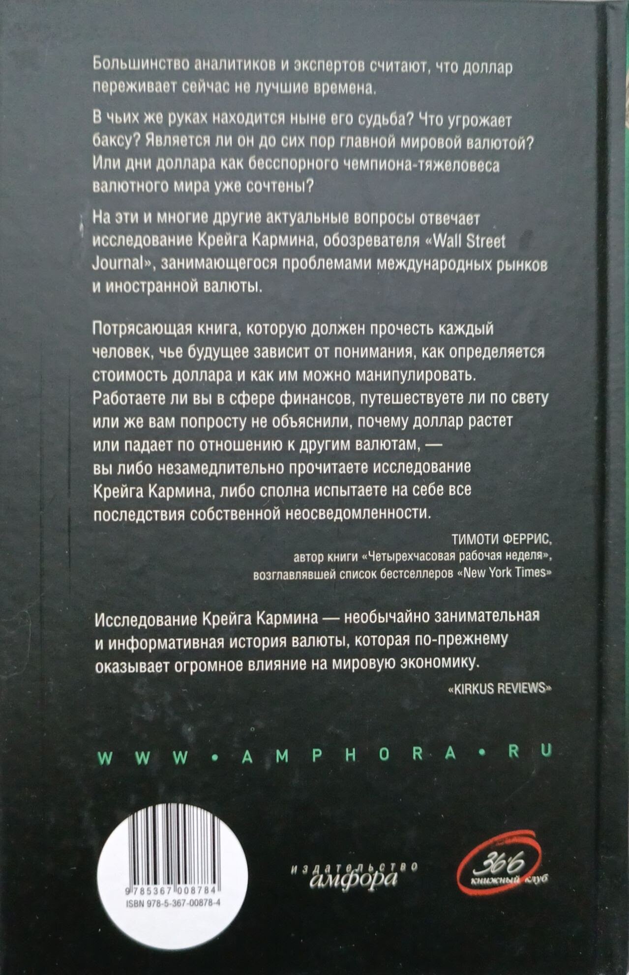 Потрясающая книга, которую должен прочесть каждый человек, чье будущее зависит от понимания, как определяется стоимость доллара и как им можно манипулировать. Работаете ли вы в сфере финансов, путешествуете ли по свету или же вам попросту не объяснили, почему доллар растет или падает по отношению к другим валютам, - вы либо незамедлительно прочитаете исследование Крейга Кармина, либо сполна испытаете на себе все последствия собственной неосведомленности.