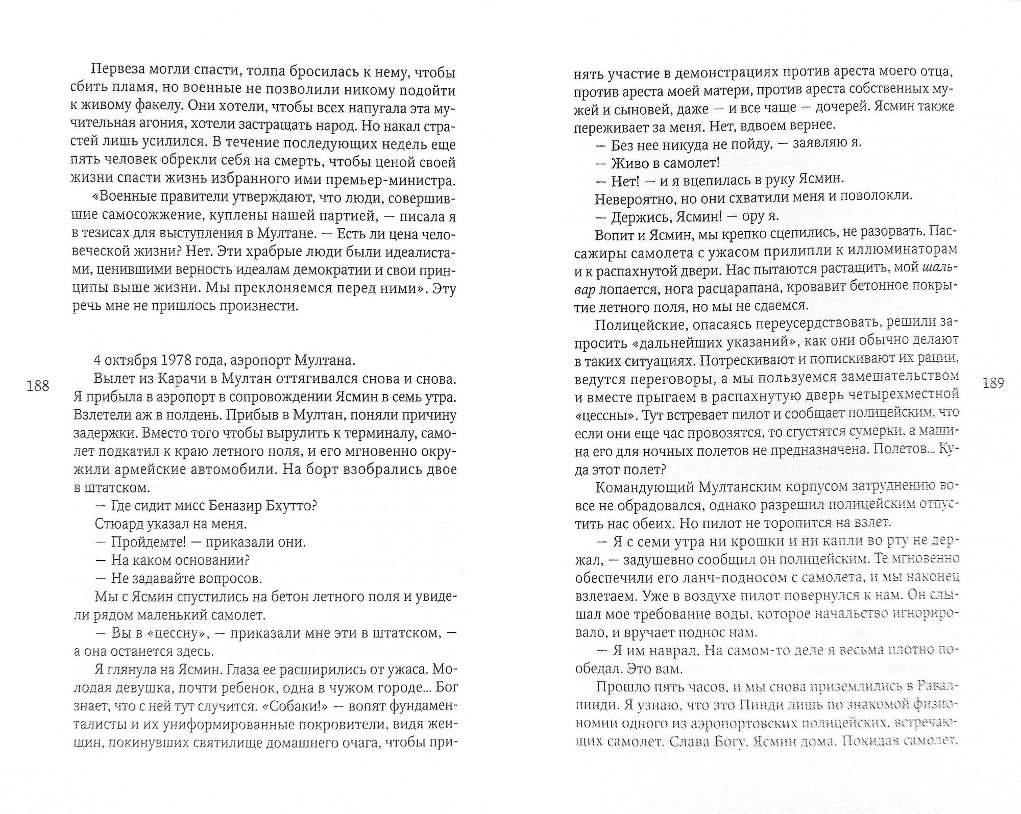 Автобиография Беназир Бхутто (1953-2007), лидера Пакистанской народной партии, премьер-министра Пакистана в 1998-1990 и 1993-1996 гг., первой в новейшей истории женщины, возглавлявшей правительство в стране преимущественно с мусульманским населением.