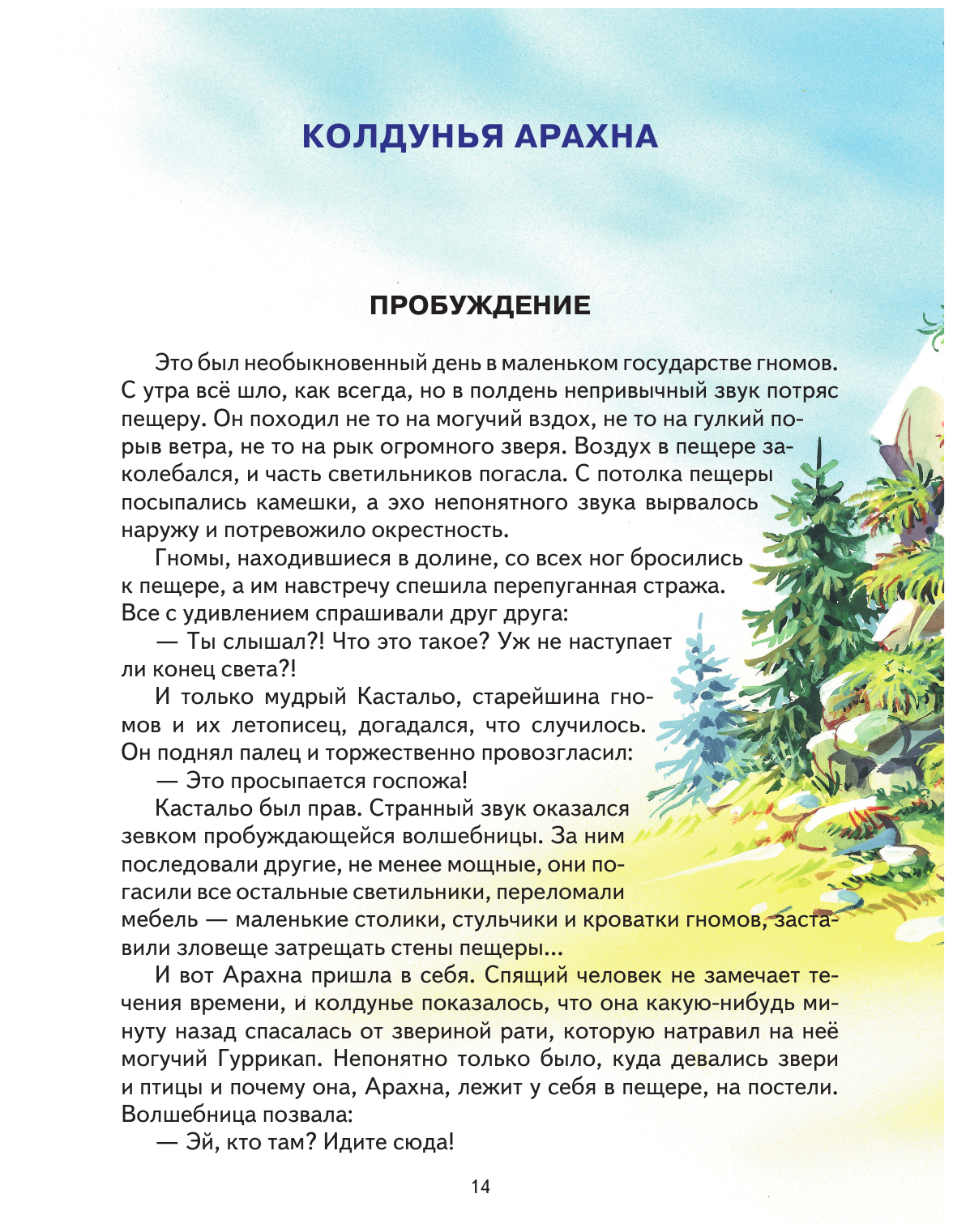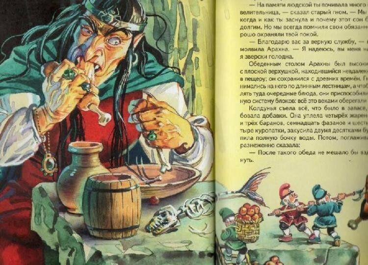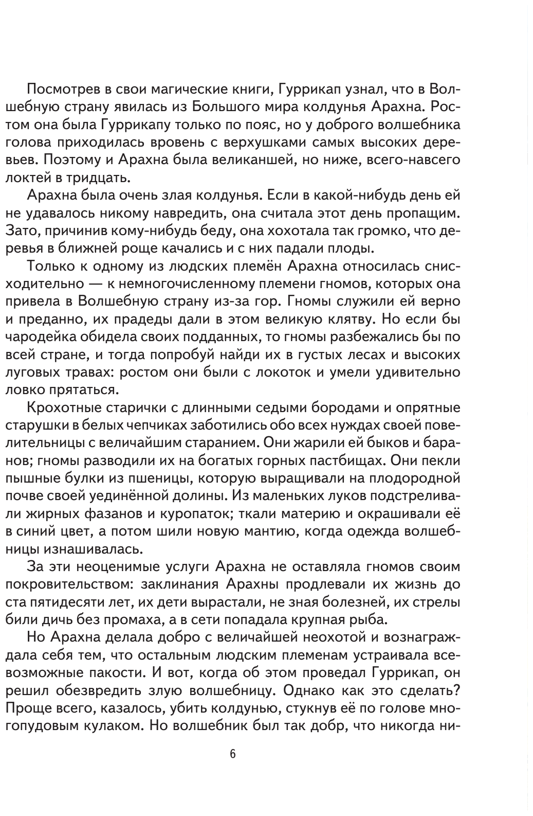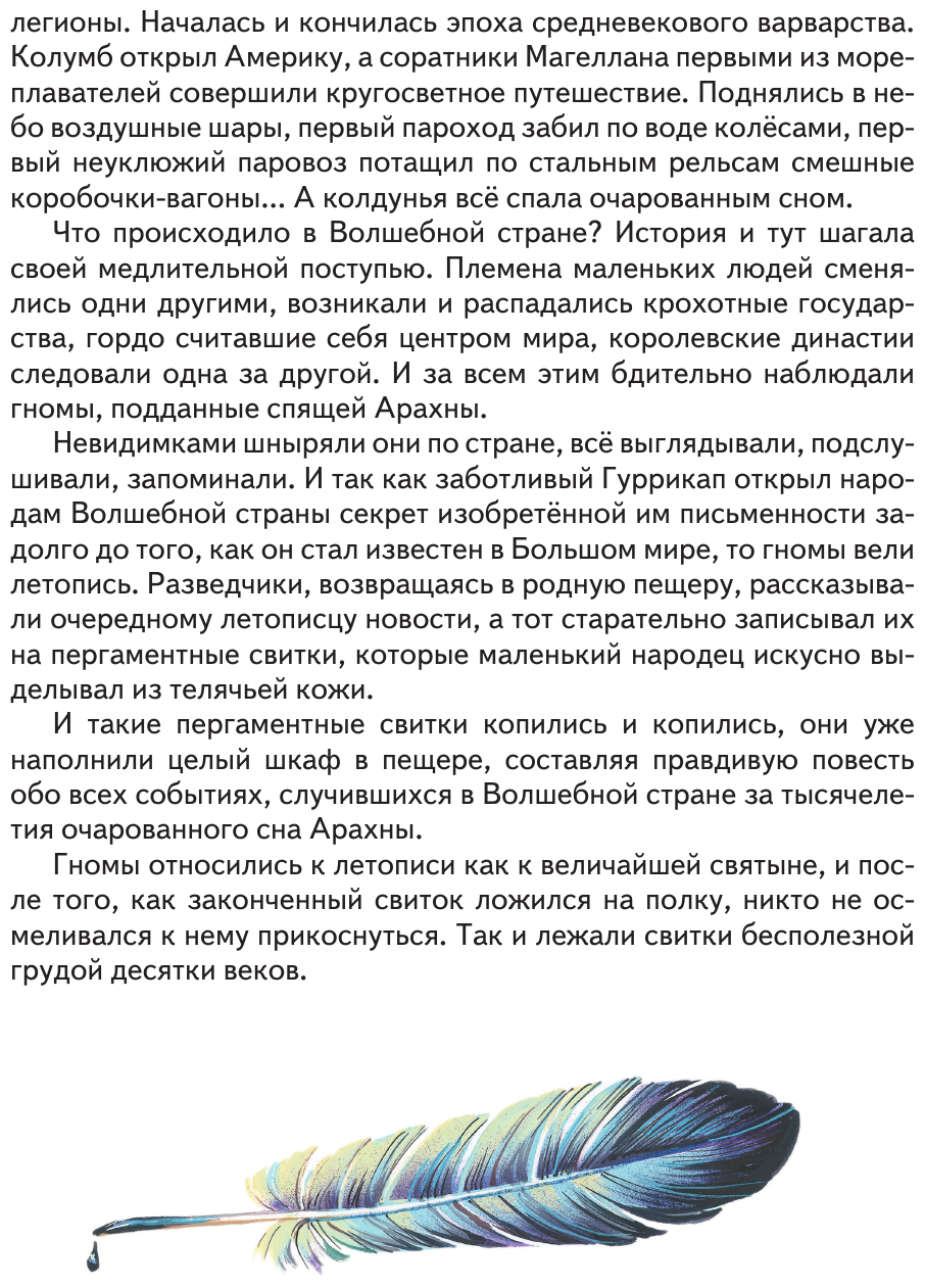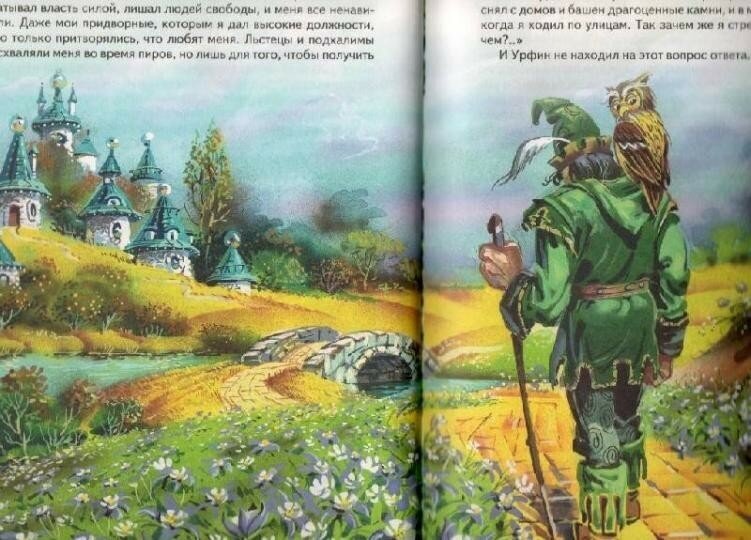 иллюстрации В.Канивца практически на каждой странице. Как мне кажется, они наиболее точно изображают содержание книги, но несколько грубоваты. Шрифт книги достаточно большой, для того чтобы книгу смог прочитать подросший ребенок. А сказка очень интересная Элли выросла и теперь на помощь Волшебной стране приходит ее младшая сестра Энни , одноногий моряк Чарли Блек, Тим О’Келли и железный рыцарь Тили-Вилли ну и конечно же наши старые друзья Сташила, Железный дровосек, а Смелый лев состарился и не принимал участия в спасении Волшебной страны от злой колдуньи Арахны наславшей Желтый туман, который принес множество бедствий волшебной стране.