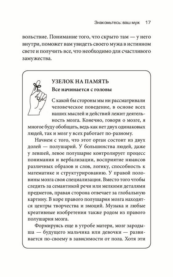 Удачно написанное руководство по мужской психологии. Рассматриваются основные конфликтные ситуации, возникающие в каждой паре (официальной или гражданской) - не дарит цветы, забывает даты, груб с детьми, не признает свои ошибки, ожидает похвалы за смехотворные одолжения, которые и так должен выполнять. Автор предлагает взглянуть на причину данного поведения с медицинской точки зрения (влияние определенных гормонов, отличных от женских) и постепенно выводит на психологический уровень - необходимость быть защитником, необходимость быть добытчиком. Книга действительно ставит на места многое, будет полезна и девочкам, и мальчикам, и взрослым.