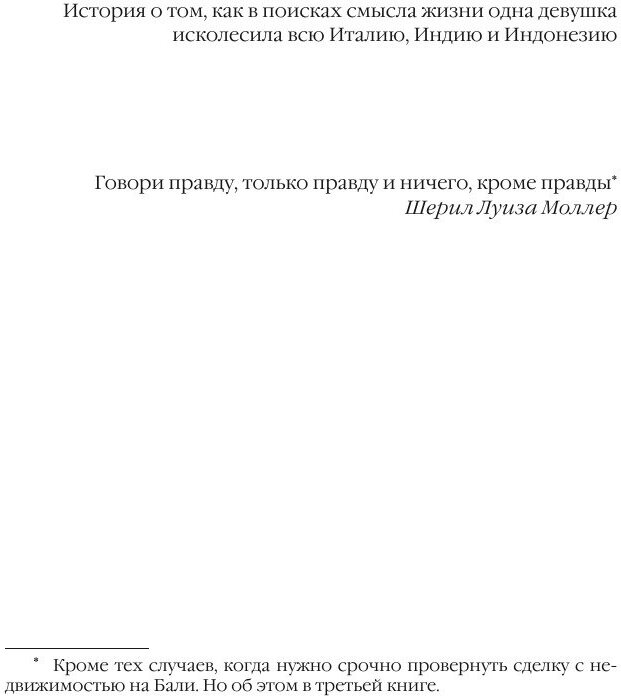 Резюме: если вы берете эту книжку в руки с целью узнать что-то новое об Индии, Италии или Индонезии, то ожидания оправдаются в очень незначительной степени. Это только один из взглядов, даже не пытающийся быть объективным, и гораздо в большей степени взгляд внутрь себя, чем наружу. Своего рода эмоциональный дневник.
