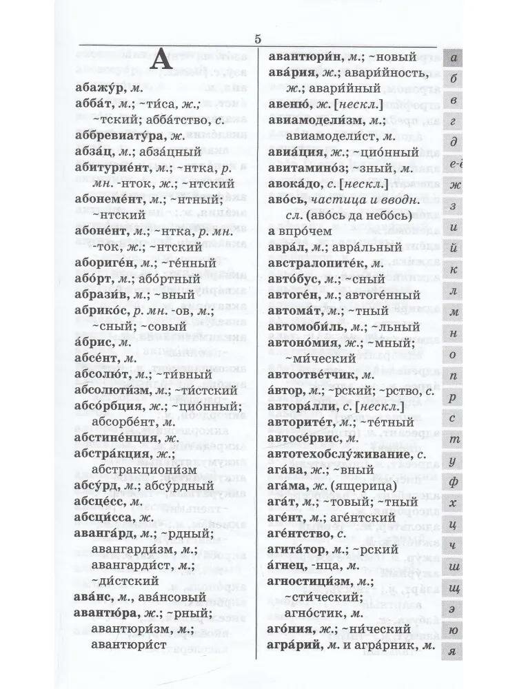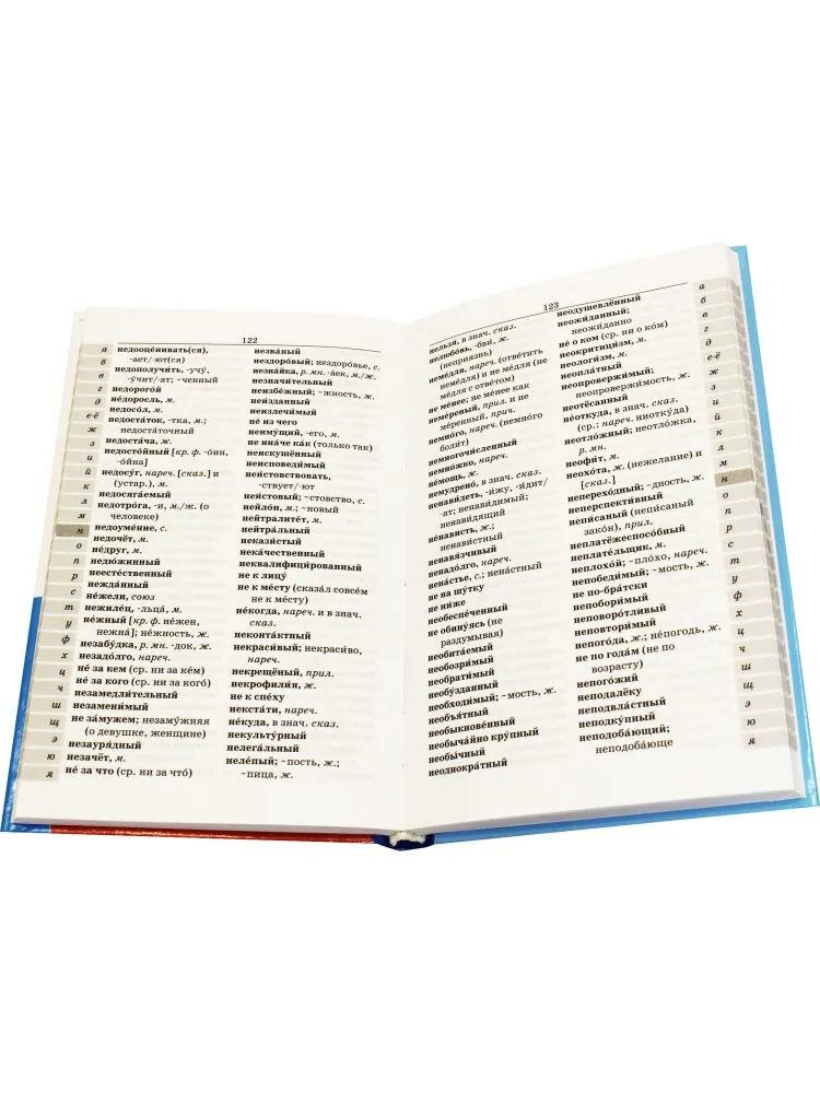Обложка твердая, глянцевая. Бумага белая, гладкая, немного просвечивает. Текст расположен в две колонки. Шрифт четкий, основное слово напечатано жирным шрифтом, дополнительная информация – обычным и курсивом. По всей длине поля страницы напечатан алфавит, в котором затемнена та буква, на которой открыт словарь.