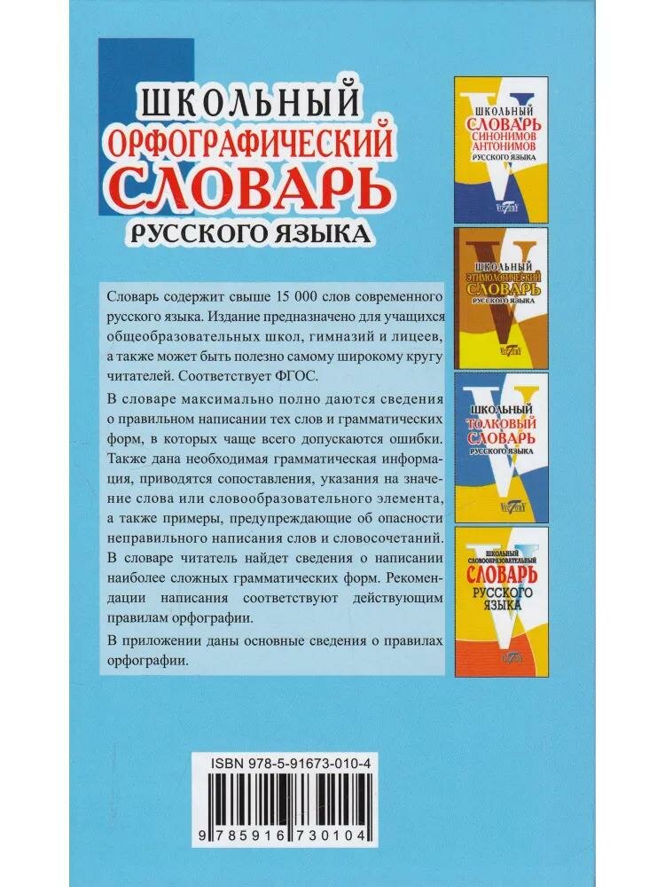 Книга предназначена для учеников и студентов, для учителей и просто семьи. Послужит отличным помощником современному школьнику, а они ведь всегда перегружены и часто бывают трудности в написании слов. Этот словарь поможет овладеть грамотностью, всегда прослужит хорошо (что тоже, согласитесь необходимо) и просто станет вашим другом. В книге также коротко рассказывается о правилах орфографии.