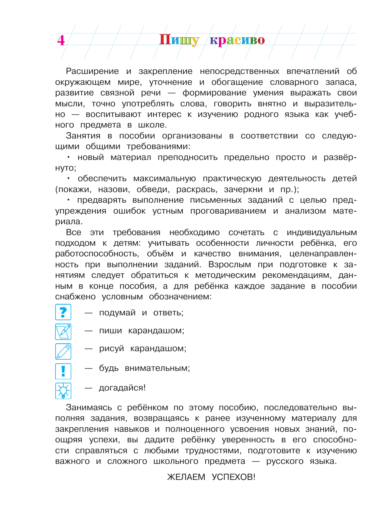 Выполняя разнообразные игровые задания на рисование линий и предметов, штриховку, раcкрашивание, дорисовывание, копирование по клеткам, ребёнок сможет укрепить пальчики руки и развить графические навыки, внимание, воображение, стать более аккуратным и усидчивым. Обучая дошкольника письму, взрослый должен обращать внимание, прежде всего, на развитие глазомера, правильную постановку руки, формирование умения писать буквы на строке ровно и красиво. Все задания, представленные в книге, расположены по мере усложнения и ориентированы на реальные возможности дошкольников.