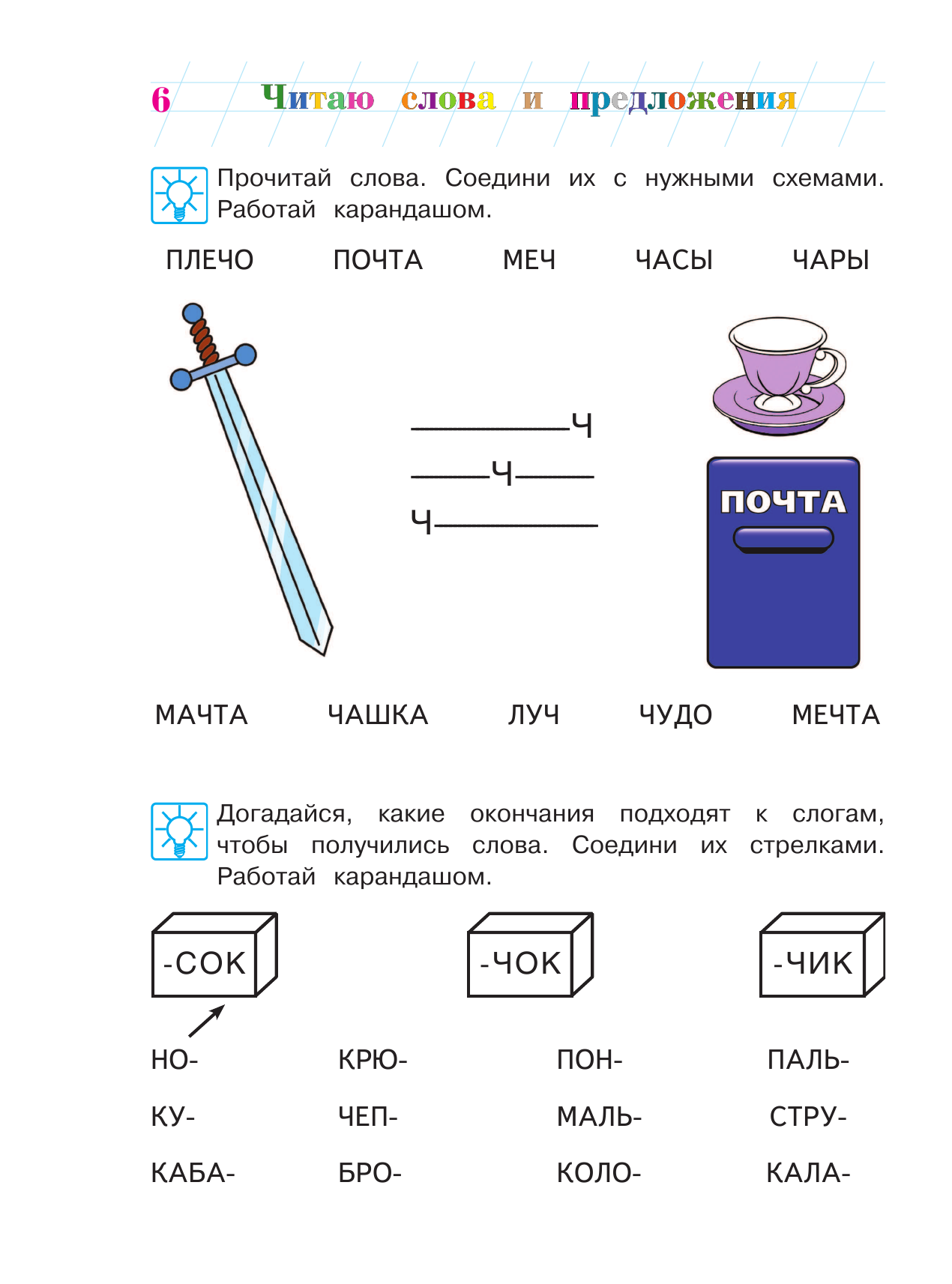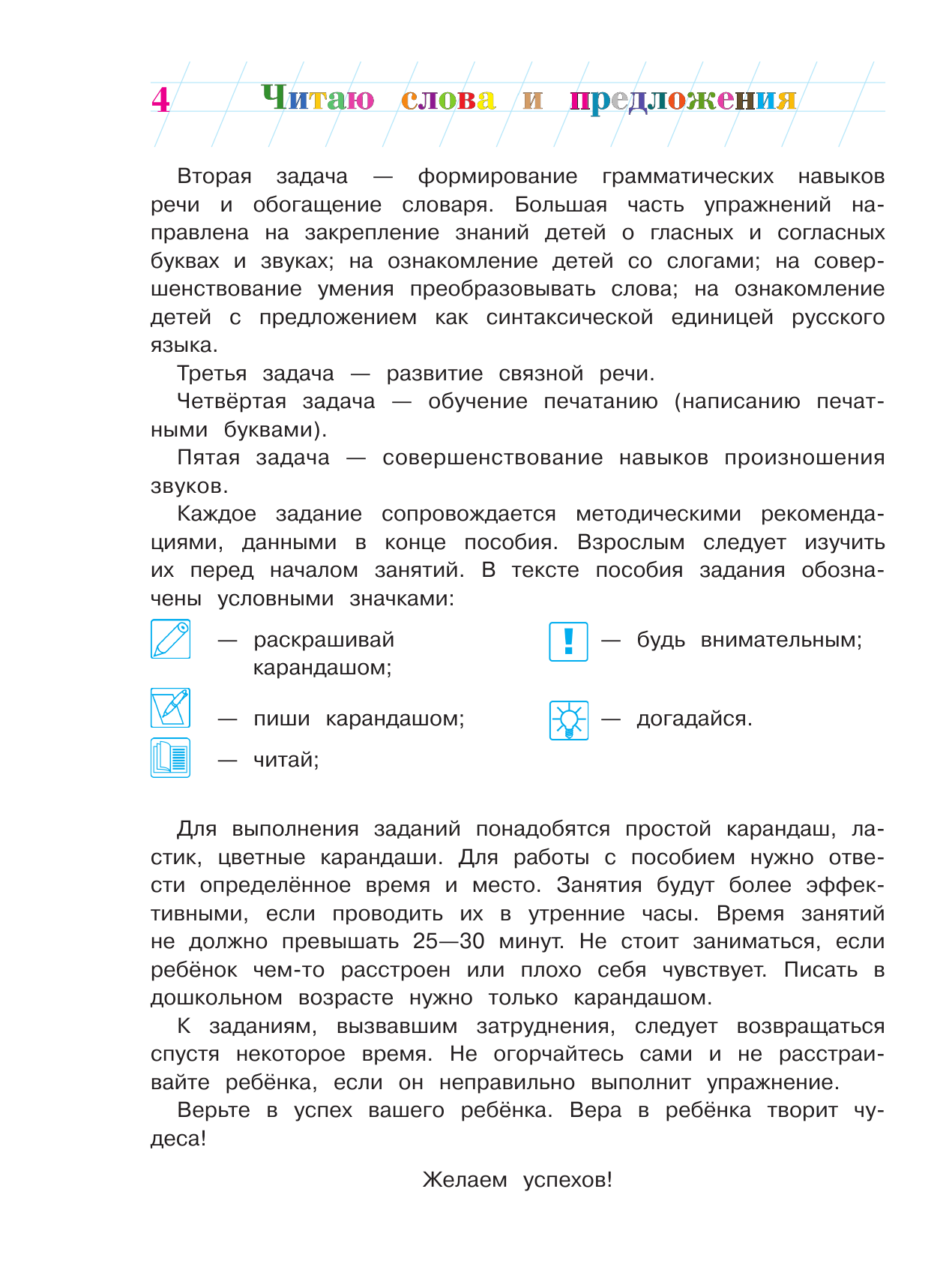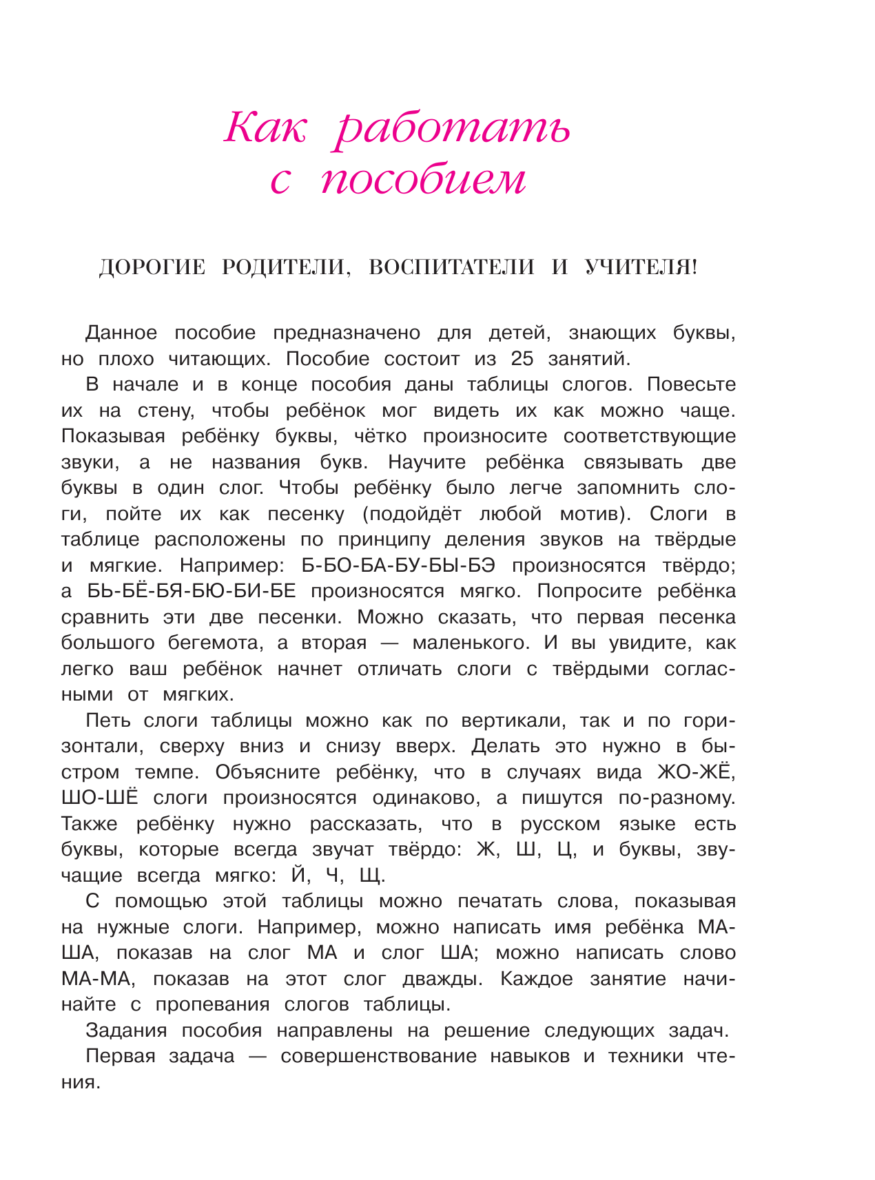 Данное пособие подготовлено для детей, которые уже знают буквы. Основные задачи издания: усовершенствовать навыки и технику чтения; закрепить знания о гласных и согласных звуках и буквах; познакомить со слогом как частью слова и с предложением как синтаксической единицей русского языка; закрепить навыки письма печатными буквами.
