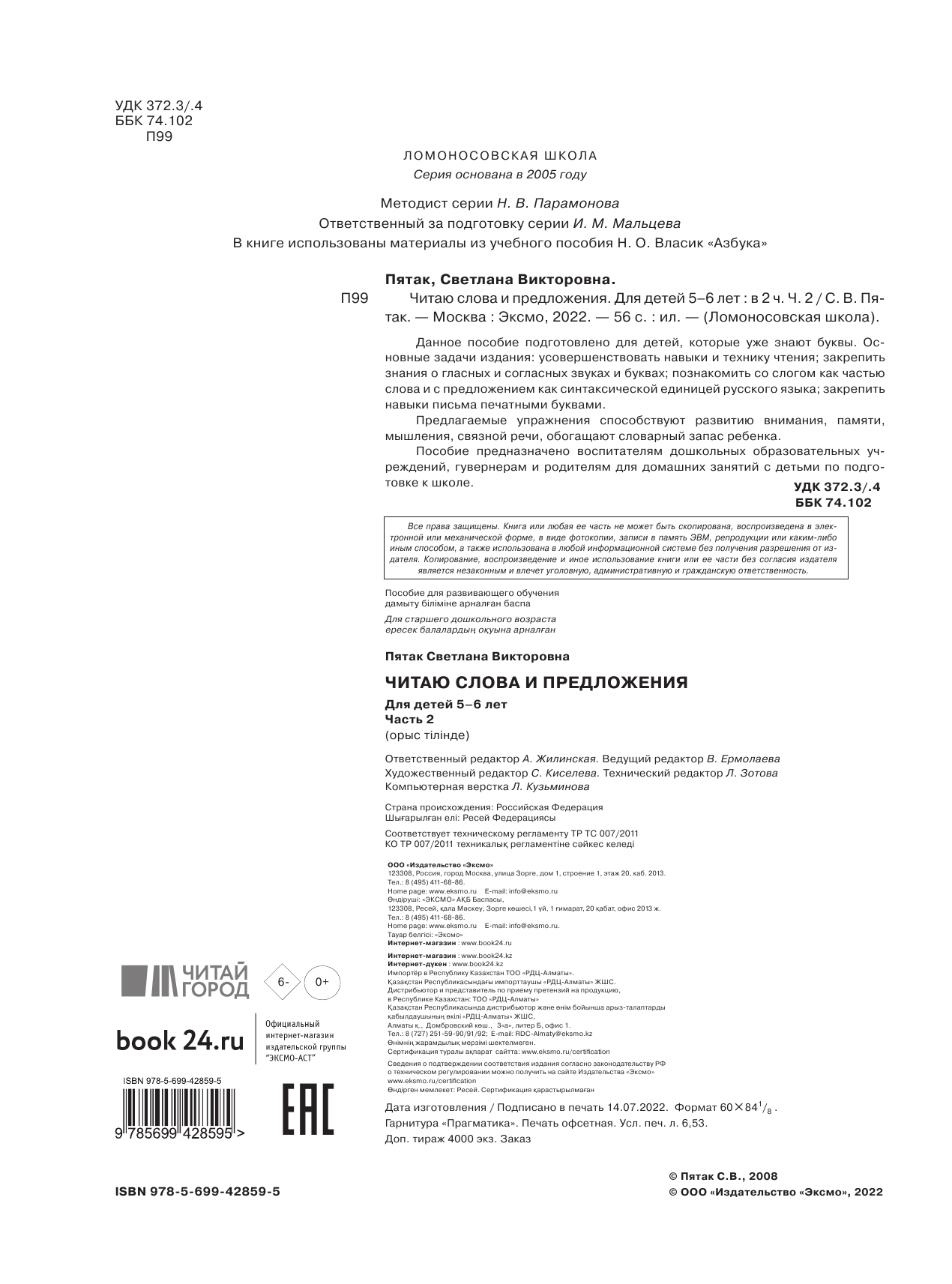 Читаю слова и предложения. Для детей 5-6 лет. В 2-х частях. Часть 2 (Пятак Светлана Викторовна); Эксмодетство, 2021