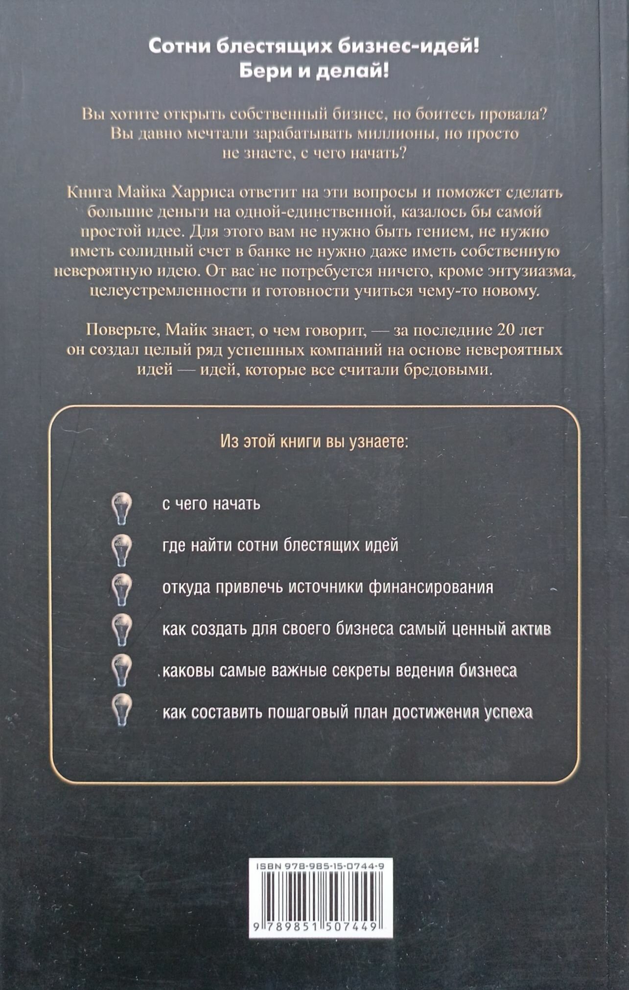 Вы хотите открыть собственный бизнес, но боитесь провала? Вы давно мечтали зарабатывать миллионы, но просто не знаете, с чего начать? Если вы забуксовали на этапе поиска идеи, источника финансирования или бренда, это руководство поможет вам принять наилучшее из возможных решений. В книге собраны уроки бесценного 20-летнего опыта, приобретенного Майком Харрисом в большом бизнесе, и эксклюзивные советы культовых фигур в области креатива, инноваций и предпринимательства.