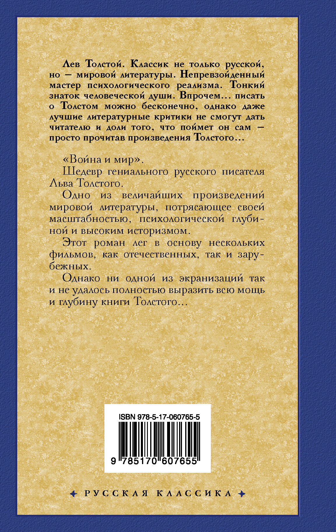 Шедевр гениального русского писателя Льва Толстого.Одно из величайших произведений мировой литературы, потрясающее своей масштабностью, психологической глубиной и высоким историзмом.Этот роман лег в основу нескольких фильмов, как отечественных, так и зарубежных.Однако ни одной из экранизаций так и не удалось полностью выпазить всю мощь и глубину книги Толстого.