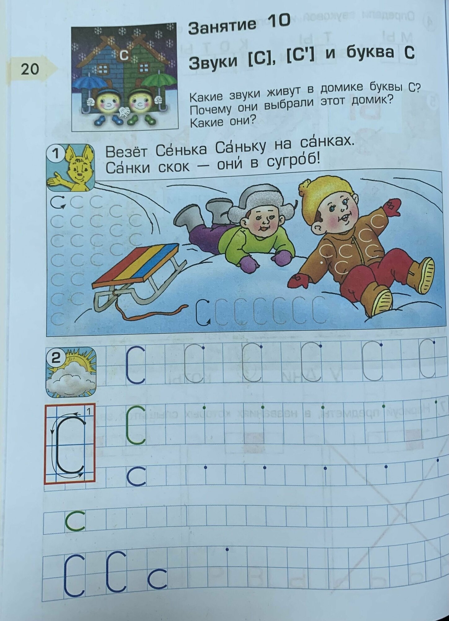 В целом книга очень понравилась, много заданий:штриховка, скороговорки, пропись печатных букв, составление предложений, ребусы и т.д. Вводится понятие -ударение, творческие задания присутствуют, цветные иллюстрации. -